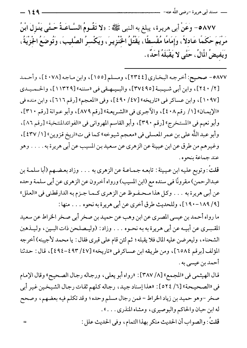 ٥٨٧٧ - صحيح: أخرجه البخارى [٢٣٤٤]، ومسلم [١٥٥]، وابن ماجه [٤٠٧٨]، وأحمد [٢/ ٢٤٠] وابن أبى شيبة [٣٧٤٩٥]، والبيهقى في "سننه" [١١٣٢٩]، والحميدى [١٠٩٧]، وابن عساكر في "تاريخه" [٤٧/ ٤٩٠]، وفى "المعجم" [رقم ٦١٦]، وابن منده في "الإيمان" [١/ رقم ٤٠٨]، والآجرى في "الشريعة" [رقم ٨٧٩]، وأبو عوانة [رقم ٣١٠]، وأبو نعيم في "المستخرج" [رقم ٣٩٠]، وأبو القاسم المهروانى في "الفوائد المنتخبة" [رقم ٨٦]، وأبو عبد الله على بن عمر المعسلى في "معجم شيوخه" كما في "تاريخ قزوين" [١/ ٤٣٧]، وغيرهم من طرق عن ابن عيينة عن الزهرى عن سعيد بن المسيب عن أبى هريرة به .... وهو عند جماعة بنحوه.