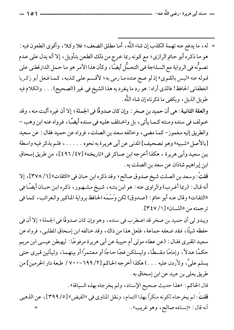ويبدو لى أن حميد بن صخر قد اضطرب في سنده، وهو وإن كان صدوقًا في الجملة؛ إلا أن في حفظه شيئًا، فقد ضعفه جماعة، فلعل هذا من ذاك، وقد خالفه ابن إسحاق المطلبى، فرواه عن سعيد المقبرى فقال: (عن عطاء مولى أم حبيبة عن أبى هريرة مرفوعًا: ليهبطن عيسى ابن مريم حكمًا عدلًا، وإمامًا مقسطًا، وليسلكن فجّا حاجًا أو معتمرًا أو بينهما، وليأتين قبرى حتى يسلم عليَّ؛ ولأردن عليه ... ) هكذا أخرجه الحاكم [٢/ ٦٩٩ - ٧٠٠/ طبعة دار الحرمين] من طريق يعلى بن عبيد عن ابن إسحاق به.