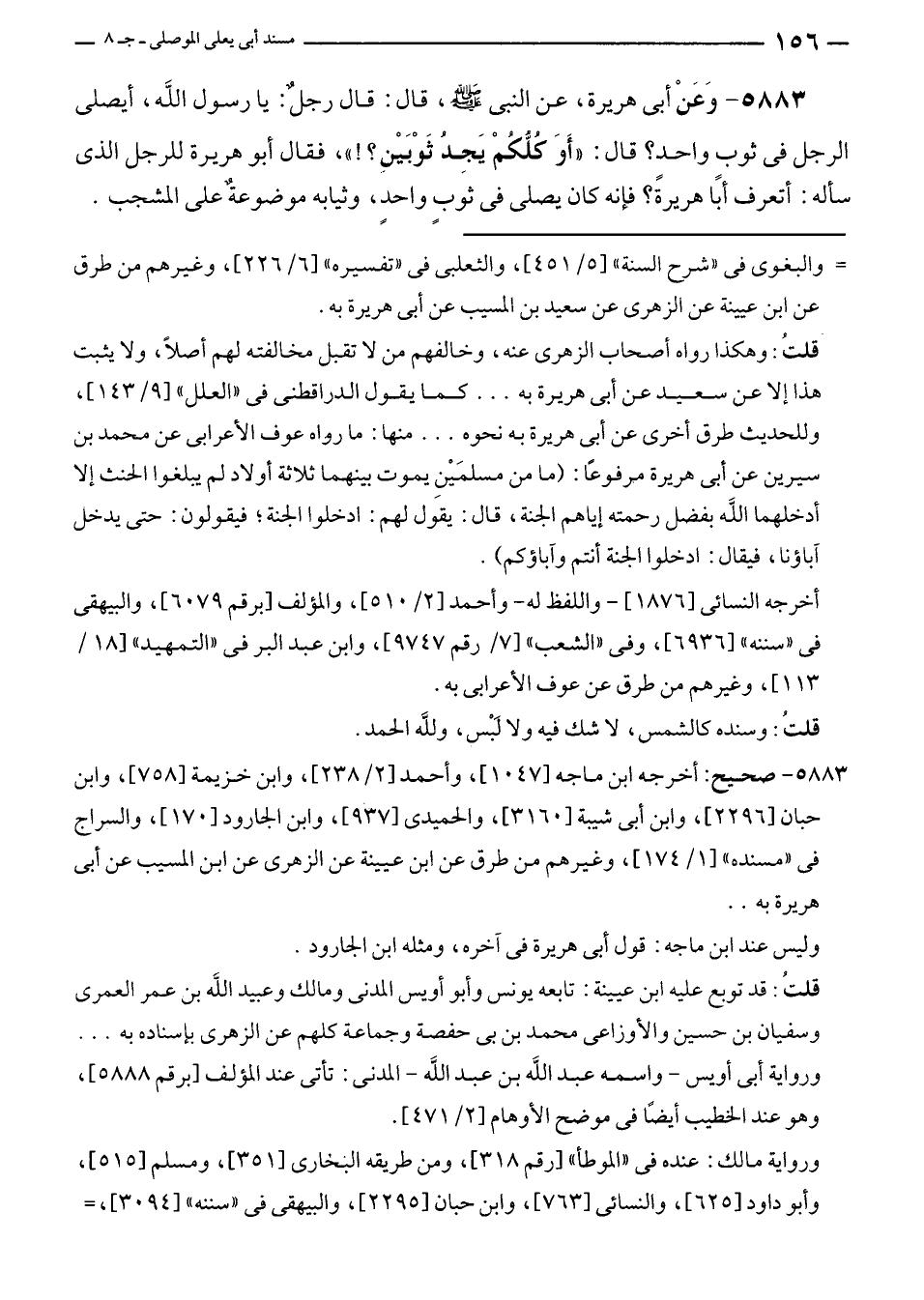 ٥٨٨٣ - وَعَنْ أبي هريرة، عن النبي - صلى الله عليه وسلم -، قال: قال رجلٌ: يا رسول الله، أيصلى الرجل في ثوبٍ واحدٍ؟ قال: "أَوَ كُلُّكُمْ يَجِدُ ثَوْبَيْنِ؟! "، فقال أبو هريرة للرجل الذي سأله: أتعرف أبا هريرة؟ فإنه كان يصلى في ثوبٍ واحدٍ، وثيابه موضوعةٌ على المشجب.