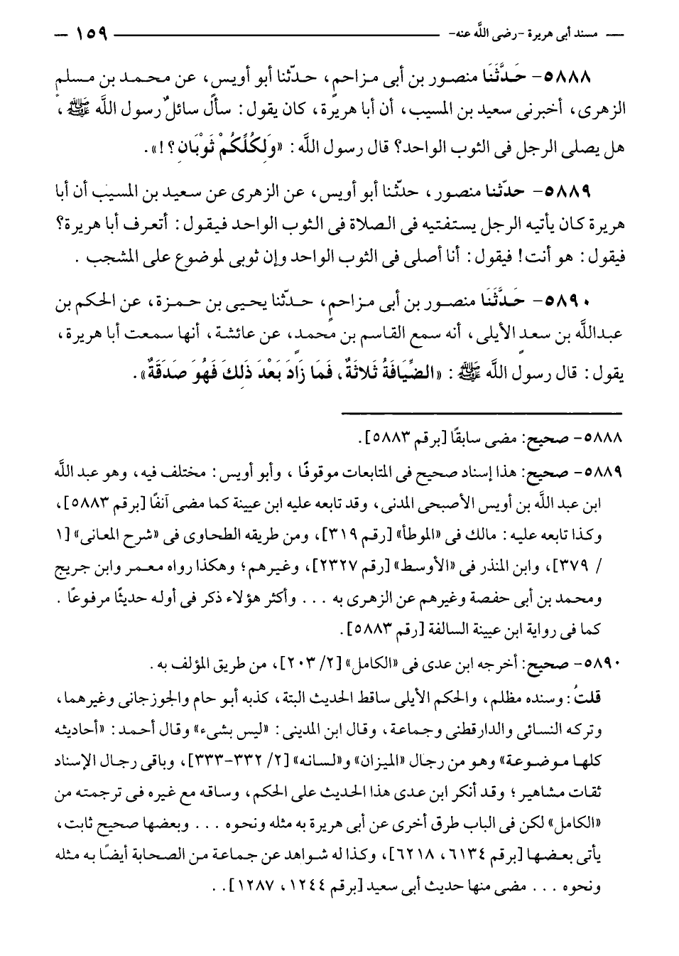 ٥٨٨٩ - صحيح: هذا إسناد صحيح في المتابعات موقوفًا، وأبو أويس: مختلف فيه، وهو عبد الله بن عبد الله بن أويس الأصبحى المدنى، وقد تابعه عليه ابن عيينة كما مضى آنفًا [برقم ٥٨٨٣]، وكذا تابعه عليه: مالك في "الموطأ" [رقم [٣١٩]، ومن طريقه الطحاوى في "شرح المعانى" [١/ ٣٧٩]، وابن المنذر في "الأوسط" [رقم ٢٣٢٧]، وغيرهم؛ وهكذا رواه معمر وابن جريج ومحمد بن أبى حفصة وغيرهم عن الزهرى به ... وأكثر هؤلاء ذكر في أوله حديثًا مرفوعًا.
