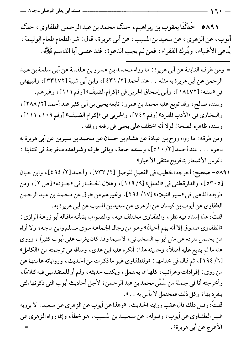 ٥٨٩١ - صحيح: أخرجه الخطيب في الفصل للوصل [٢/ ٧٣٣]، وأحمد [٢/ ٤٩٤]، وابن حبان [٥٣٠٥]، والدارقطنى في "العلل" [٩/ ١١٩]، وهلال الحفار في "جزئه" [ص ٢]، ومن طريقه الذهبى في "سير النبلاء" [٧١/ ٢٩٤]، وغيرهم من طرق عن محمد بن عبد الرحمن الطفاوى عن أيوب بن كيسان عن الزهرى عن سعيد بن المسيب عن أبى هريرة به.