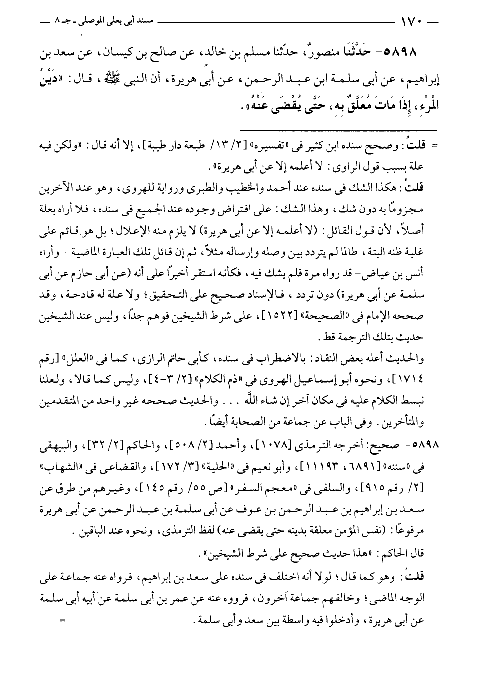 ٥٨٩٨ - حَدَّثَنَا منصورٌ، حدّثنا مسلم بن خالدٍ، عن صالح بن كيسان، عن سعد بن إبراهيم، عن أبى سلمة بن عبد الرحمن، عن أبى هريرة، أن النبي - صلى الله عليه وسلم -، قال: "دَيْنُ المرْءِ، إِذَا مَاتَ مُعَلَّقٌ بِهِ، حَتَّى يُقْضَى عَنْهُ".