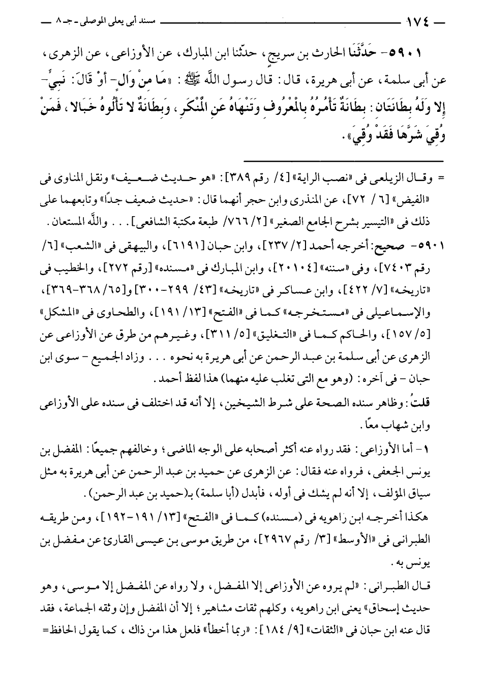 ١ - أما الأوزاعى: فقد رواه عنه أكثر أصحابه على الوجه الماضى؛ وخالفهم جميعًا: المفضل بن يونس الجعفى، فرواه عنه فقال: عن الزهرى عن حميد بن عبد الرحمن عن أبى هريرة به مثل سياق المؤلف، إلا أنه لم يشك في أوله، فأبدل (أبا سلمة) بـ (حميد بن عبد الرحمن).