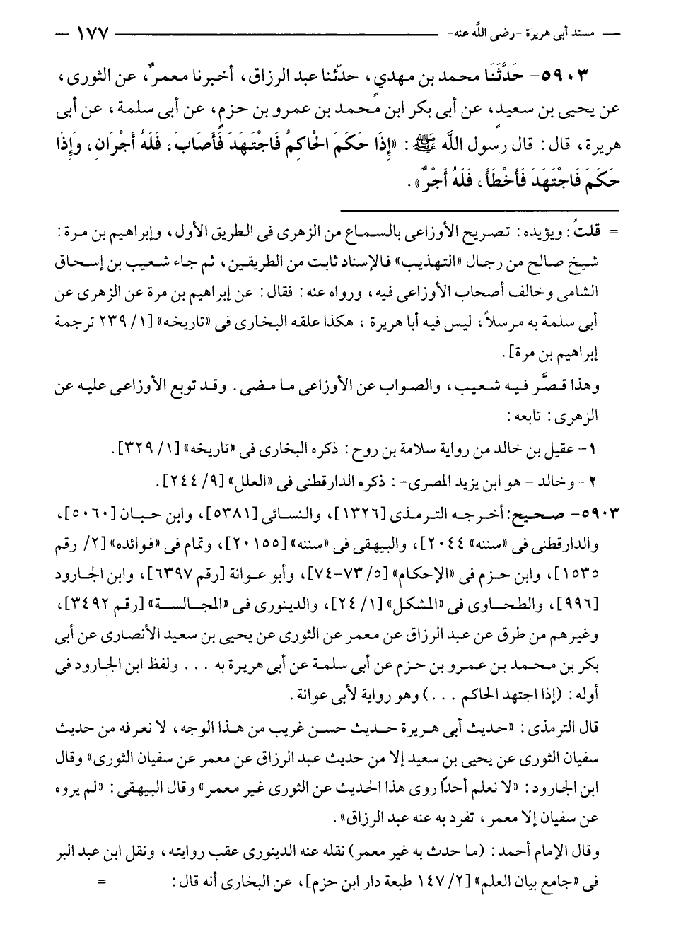 ٥٩٠٣ - حَدَّثَنَا محمد بن مهديٍ، حدّثنا عبد الرزاق، أخبرنا معمرٌ، عن الثورى، عن يحيى بن سعيدٍ، عن أبى بكر بن محمد بن عمرو بن حزمٍ، عن أبى سلمة، عن أبى هريرة، قال: قال رسول الله - صلى الله عليه وسلم -: "إِذَا حَكَمَ الحاكِمُ فَاجْتَهَدَ فَأَصَابَ، فَلَهُ أَجْرَانِ، وَإِذَا حَكَمَ فَاجْتَهَدَ فَأَخْطَأَ، فَلَهُ أَجْرٌ".
