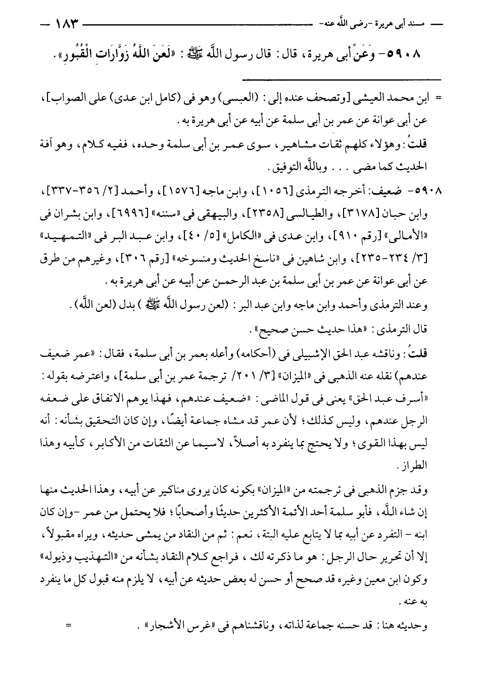 وقد جزم الذهبي في ترجمته من "الميزان" بكونه كان يروى مناكير عن أبيه، وهذا الحديث منها إن شاء الله، فأبو سلمة أحد الأئمة الأكثرين حديثًا وأصحابًا؛ فلا يحتمل من عمر - وإن كان ابنه - التفرد عن أبيه بما لا يتابع عليه البتة، نعم: ثم من النقاد من يمشى حديثه، ويراه مقبولًا، إلا أن تحرير حال الرجل: هو ما ذكرته لك، فراجع كلام النقاد بشأنه من "التهذيب وذيوله" وكون ابن معين وغيره قد صحح أو حسن له بعض حديثه عن أبيه، لا يلزم منه قبول كل ما ينفرد به عنه.