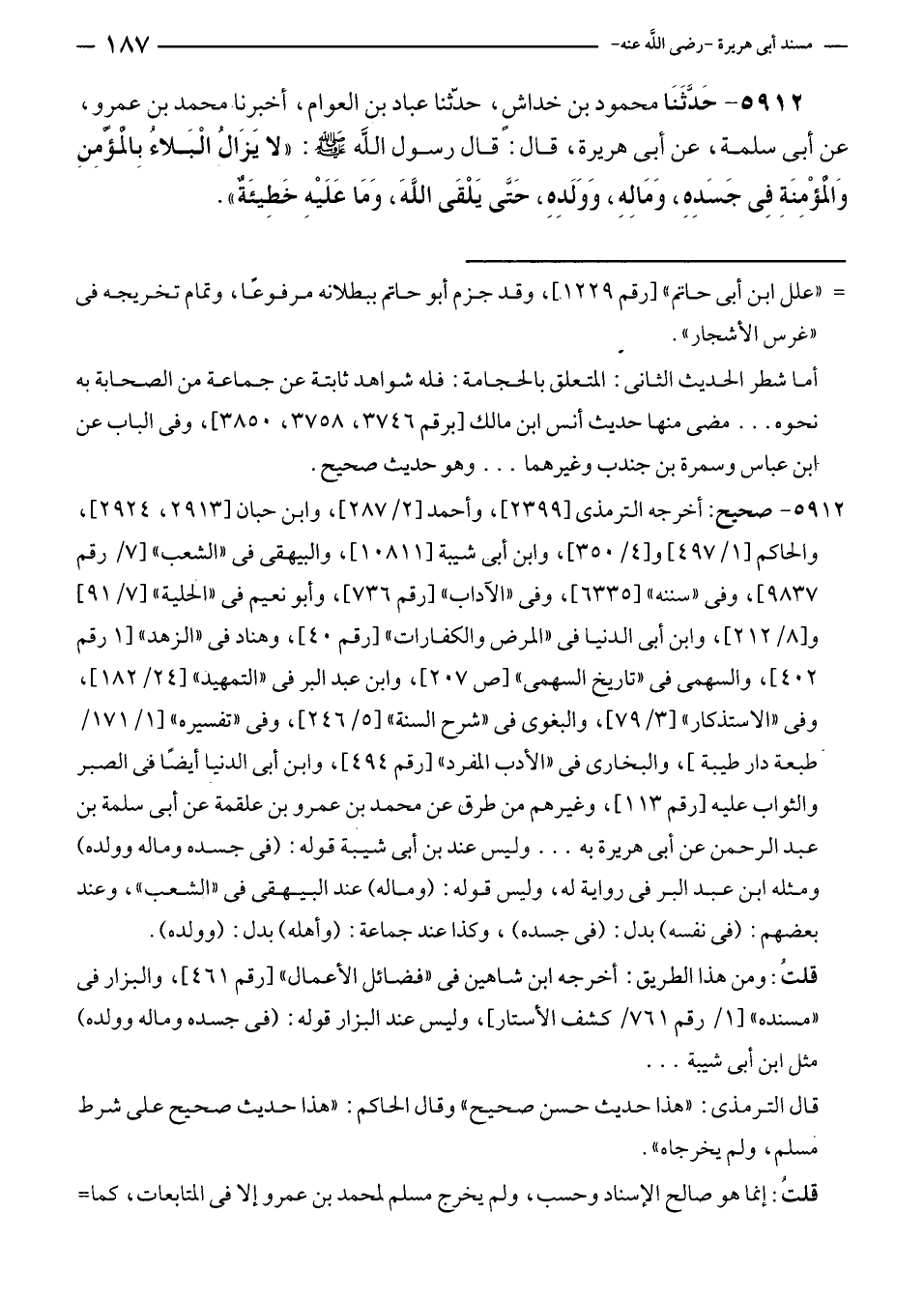 ٥٩١٢ - حَدَّثَنَا محمود بن خداشٍ، حدّثنا عباد بن العوام، أخبرنا محمد بن عمرو، عن أبي سلمة، عن أبي هريرة، قال: قال رسول الله - صلى الله عليه وسلم -: "لا يَزَالُ الْبَلاءُ بِالْمُؤمِنِ وَالْمُؤْمِنَةِ فِي جَسَدِهِ، وَمَالِهِ، وَوَلَدِهِ، حَتَّى يَلْقَى اللَّهَ، وَمَا عَلَيْهِ خَطِيئَةٌ".
