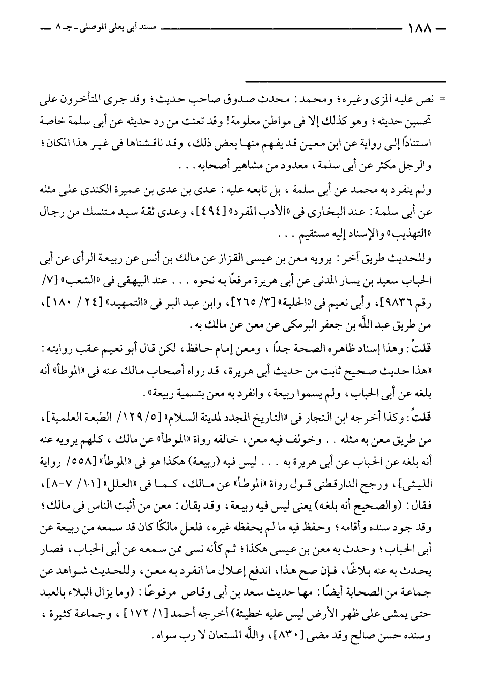 قلتُ: وكذا أخرجه ابن النجار في "التاريخ المجدد لمدينة السلام" [٥/ ١٢٩/ الطبعة العلمية]، من طريق معن به مثله .. وخولف فيه معن، خالفه رواة "الموطأ" عن مالك، كلهم يرويه عنه أنه بلغه عن الحباب عن أبي هريرة به ... ليس فيه (ربيعة) هكذا هو في "الموطأ" [٥٥٨/ رواية الليثي]، ورجح الدارقطني قول رواة "الموطأ" عن مالك، كما في "العلل" [١١/ ٧ - ٨]، فقال: (والصحيح أنه بلغه) يعني ليس فيه ربيعة، وقد يقال: معن من أثبت الناس في مالك؛ وقد جود سنده وأقامه؛ وحفظ فيه ما لم يحفظه غيره، فلعل مالكًا كان قد سمعه من ربيعة عن أبي الحباب؛ وحدث به معن بن عيسى هكذا؛ ثم كأنه نسى ممن سمعه عن أبي الحباب، فصار يحدث به عنه بلاغًا، فإن صح هذا، اندفع إعلال ما انفرد به معن، وللحديث شواهد عن جماعة من الصحابة أيضًا: مها حديث سعد بن أبي وقاص مرفوعًا: (وما يزال البلاء بالعبد حتى يمشى على ظهر الأرض ليس عليه خطيئة) أخرجه أحمد [١/ ١٧٢]، وجماعة كثيرة، وسنده حسن صالح وقد مضى [٨٣٠]، واللَّه المستعان لا رب سواه.