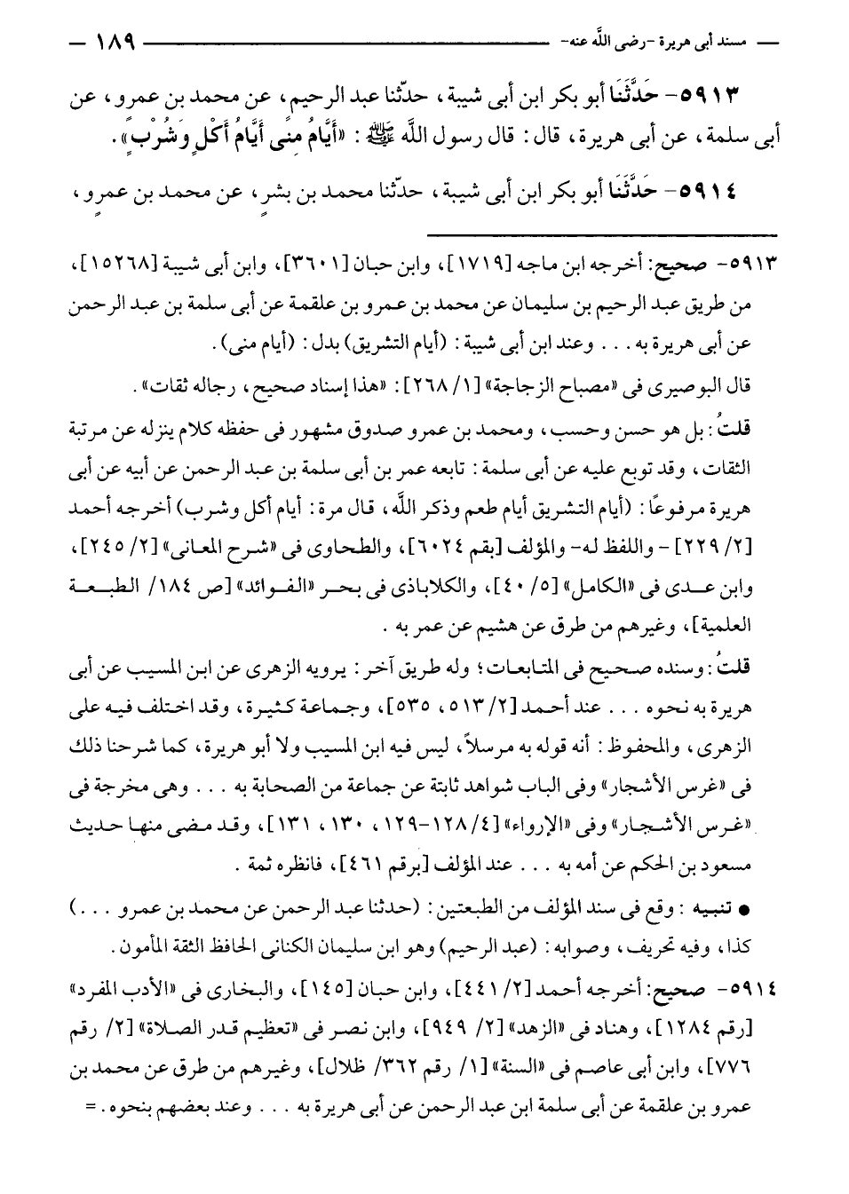 ٥٩١٣ - حَدَّثَنَا أبو بكر بن أبي شيبة، حدّثنا عبد الرحيمٍ، عن محمد بن عمرٍو، عن سلمة، عن أبي هريرة، قال: قال رسول الله - صلى الله عليه وسلم -: "أَيَّامُ مِنًى أَيَّامُ أَكْلٍ وَشُرْبٍ".