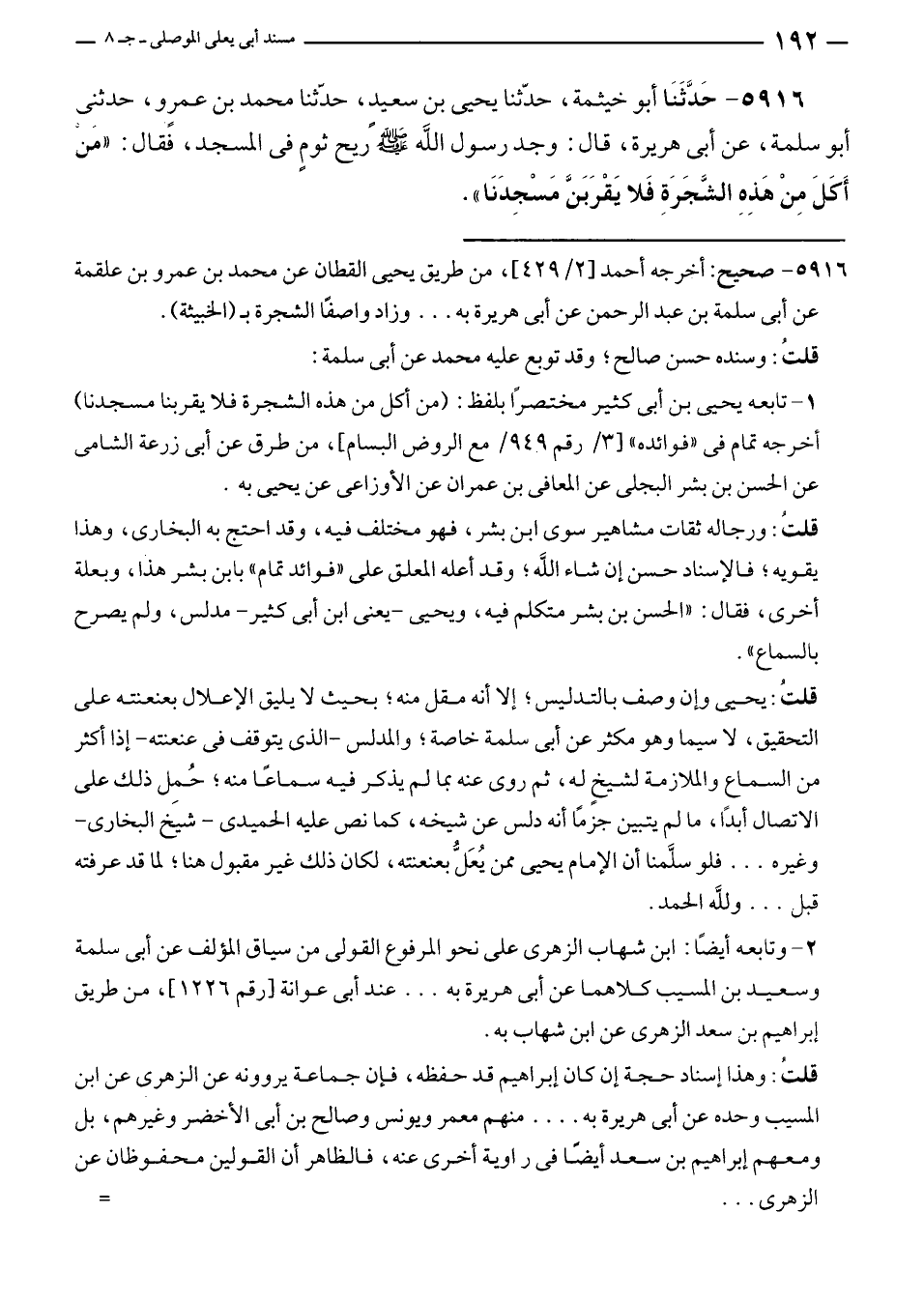 قلتُ: يحيى وإن وصف بالتدليس؛ إلا أنه مقل منه؛ بحيث لا يليق الإعلال بعنعنته على التحقيق، لا سيما وهو مكثر عن أبي سلمة خاصة؛ والمدلس - الذي يتوقف في عنعنته - إذا أكثر من السماع والملازمة لشيخٍ له، ثم روى عنه بما لم يذكر فيه سماعًا منه؛ حُمل ذلك على الاتصال أبدًا، ما لم يتبين جزمًا أنه دلس عن شيخه، كما نص عليه الحميدي - شيخ البخاري - وغيره ... فلو سلَّمنا أن الإمام يحيى ممن يُعَلُّ بعنعنته، لكان ذلك غير مقبول هنا؛ لما قد عرفته قبل ... ولله الحمد.