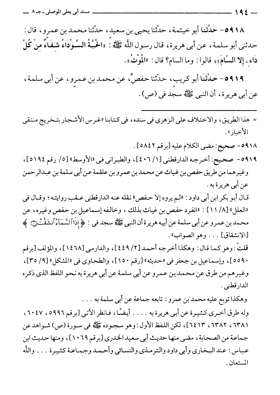 وله طرق أخرى كثيرة عن أبي هريرة به .... أيضًا، فانظر الآتى [برقم ٥٩٩٦، ٦٠٤٧، ٦٣٨١، ٦٣٨٢، ٦٤١٣]، لكن اللفظ الأول: وهو سجوده - صلى الله عليه وسلم - في سورة (ص) شواهد عن جماعة من الصحابة، مضى منها حديث أبي سعيد الخدري [برقم ١٠٦٩]، ومنها حديث ابن عباس: عند البخاري وأبي داود والترمذي والنسائي وأحمد وجماعة كثيرة ... واللَّه المستعان.