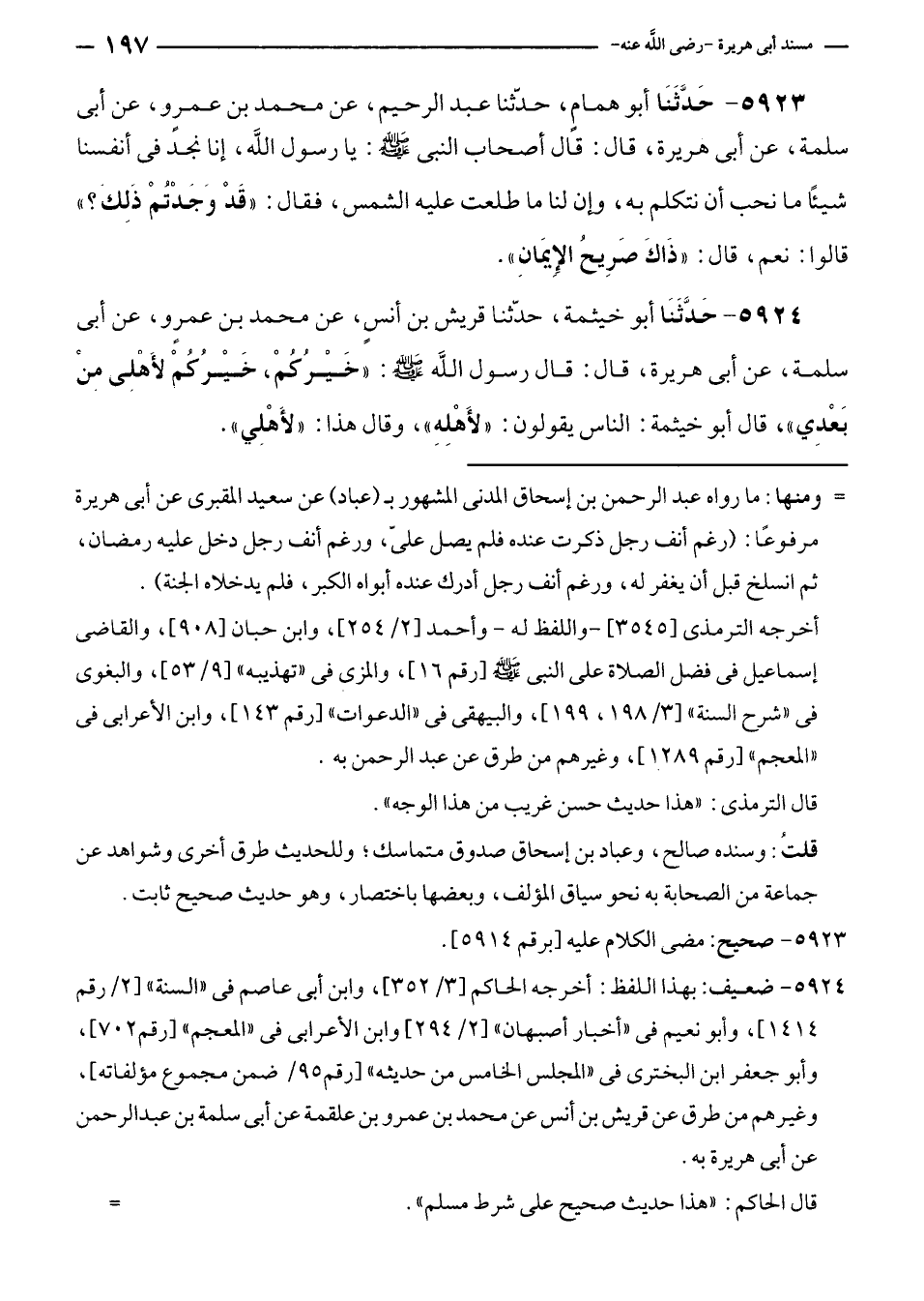 ٥٩٢٤ - حَدَّثَنَا أبو خيثمة، حدّثنا قريش بن أنسٍ، عن محمد بن عمرٍو، عن أبي سلمة، عن أبي هريرة، قال: قال رسول الله - صلى الله عليه وسلم -: "خَيْرُكُمْ، خَيْرُكُمْ لأَهْلِى مِنْ بَعْدِي"، قال أبو خيثمة: الناس يقولون: "لأَهْلِهِ"، وقال هذا: "لأَهْلي".