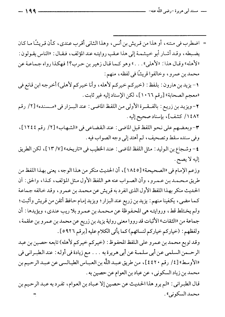 = اضطرب في متنه، أو هذا من قريش بن أنس، وهذا الثاني أقرب عندي، كأن قريشًا ما كان يضبطه، وقد أشار أبو خيثمة إلى هذا عقب روايته عند المؤلف، فقال:، (الناس يقولون: "لأهله" وقال هذا: "لأهلى" ... " وهو كما قال زهير بن حرب؟! فهكذا رواه جماعة عن محمد بن عمرو، وخالفوا قريشًا في لفظه، منهم: