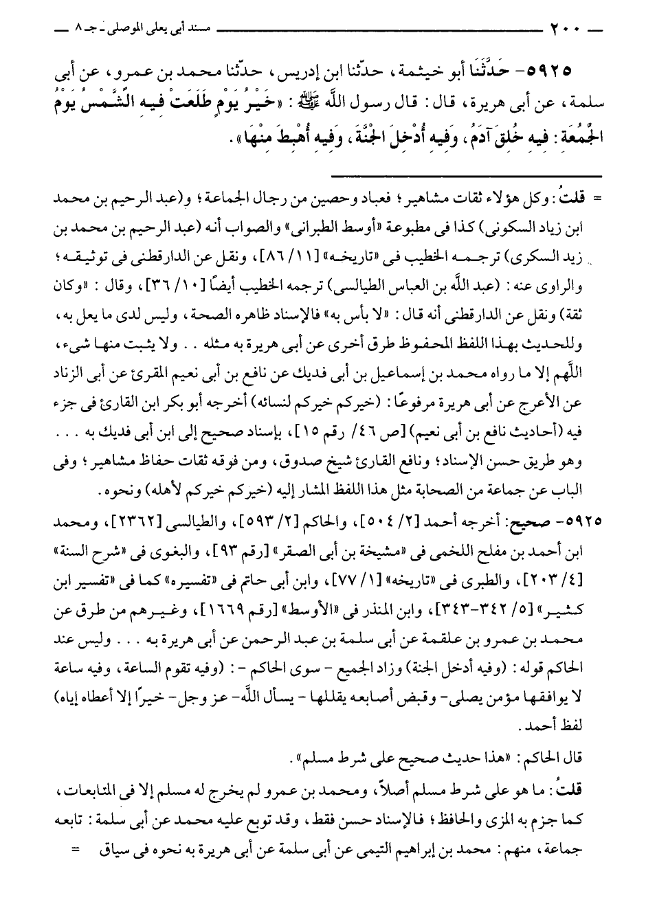 ٥٩٢٥ - حَدَّثَنَا أبو خيثمة، حدّثنا ابن إدريس، حدّثنا محمد بن عمرو، عن أبي سلمة، عن أبي هريرة، قال: قال رسول الله - صلى الله عليه وسل -: "خَيْرُ يَوْمٍ طَلَعَتْ فِيهِ الشَّمْسُ يَومُ الجُمُعَةِ: فِيهِ خُلِقَ آدَمُ، وَفِيهِ أُدْخِلَ الجَنَّةَ، وَفِيهِ أُهْبِطَ مِنْهَا".