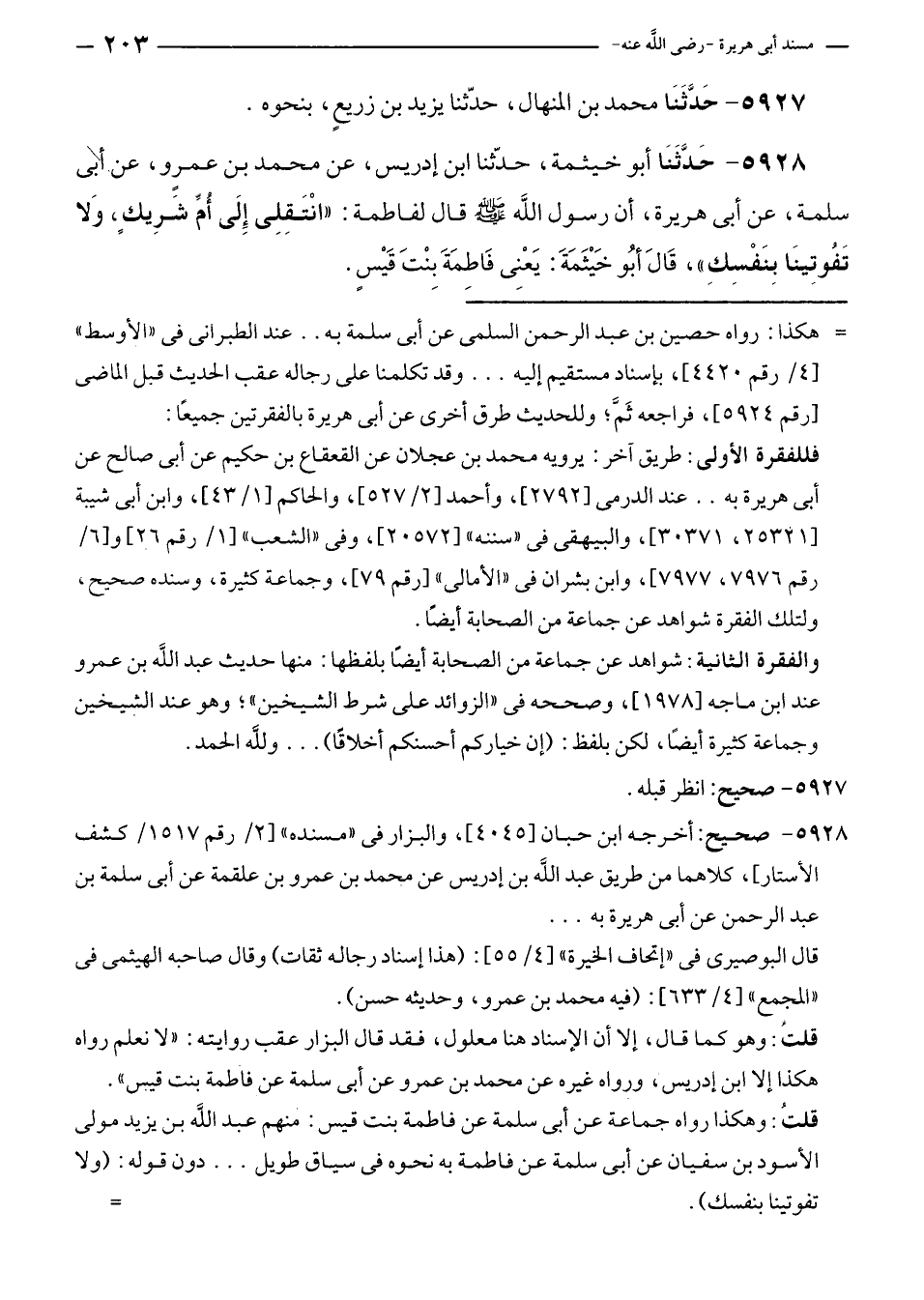 ٥٩٢٨ - صحيح: أخرجه ابن حبان [٤٠٤٥]، والبزار في "مسنده" [٢/ رقم ١٥١٧/ كشف الأستار]، كلاهما من طريق عبد الله بن إدريس عن محمد بن عمرو بن علقمة عن أبي سلمة بن عبد الرحمن عن أبي هريرة به ...