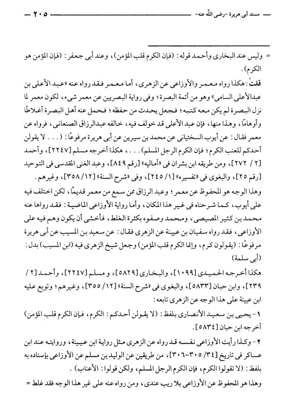 قلتُ: هكذا رواه معمر والأوزاعى عن الزهري، أما معمر فقد رواه عنه "عبد الأعلى بن عبد الأعلى السامى" وهو من أئمة البصرة؛ وفي رواية البصريين عن معمر شيء، لكون معمر لما نزل البصرة لم يكن معه كتبه؛ فجعل يحدث من حفظه؛ فحمل عنه أهل البصرة أغلاطًا وأوهامًا، وهذا منها، فإن عبد الأعلى قد خولف فيه، خالفه عبد الرزاق الصنعانى، فرواه عن معمر فقال: عن أيوب السختيانى عن محمد بن سيرين عن أبي هريرة مرفوعًا: ( ... لا يقولن أحدكم للعنب الكرم؛ فإن الكرم الرجل المسلم) ... ، هكذا أخرجه مسلم [٢٢٤٧]، وأحمد [٢/ ٢٧٢]، ومن طريقه ابن بشران في "أماليه" [رقم ٨٤٩]، وعبد الغنى المقدسى في التوحيد [رقم ٢٥]، والبغوي في "تفسيره" [١/ ٢٤٥]، وفي "شرح السنة" [١٢/ ٣٥٨]، وغيرهم.