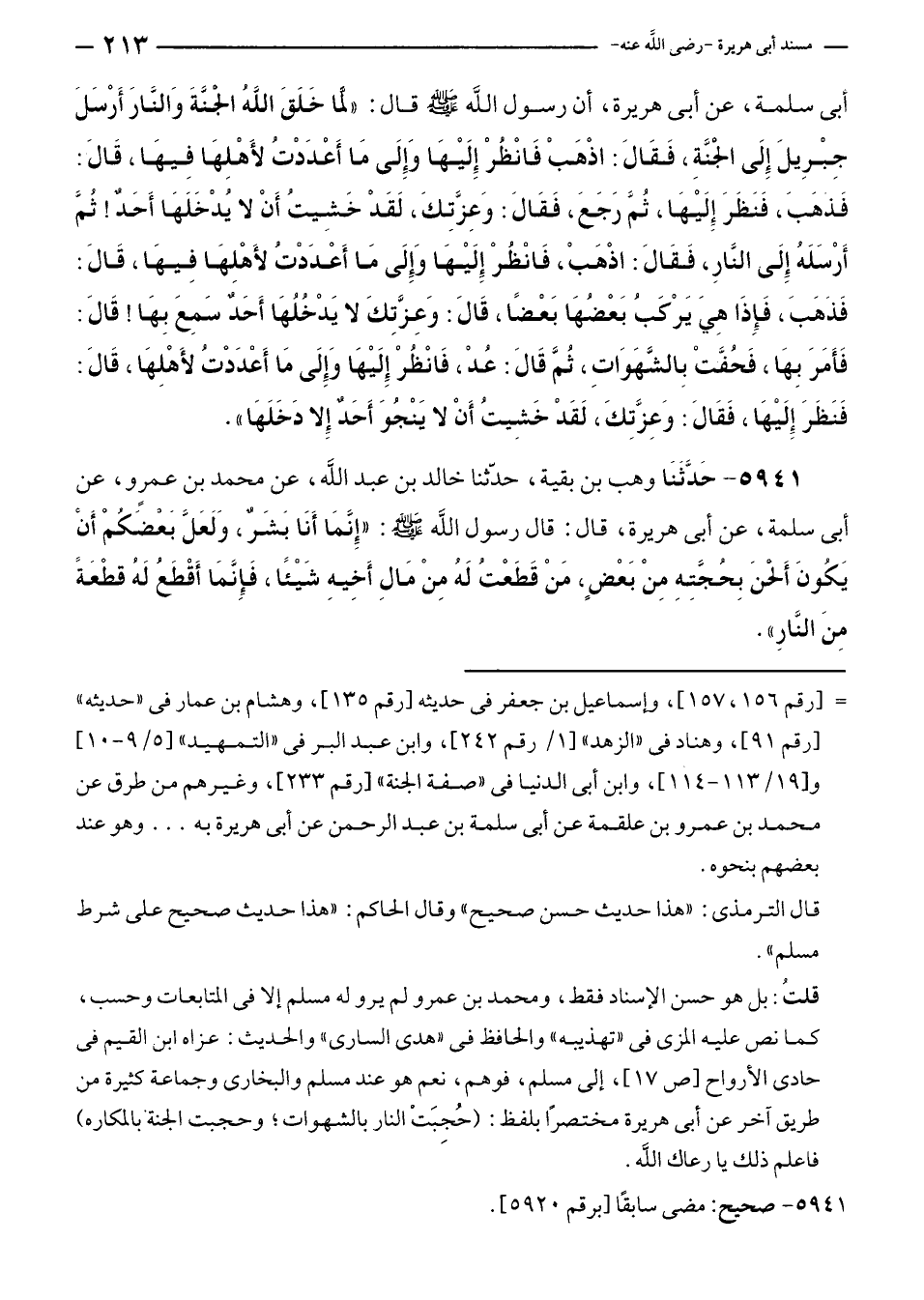 قلتُ: بل هو حسن الإسناد فقط، ومحمد بن عمرو لم يرو له مسلم إلا في المتابعات وحسب، كما نص عليه المزي في "تهذيبه" والحافظ في "هدى السارى" والحديث: عزاه ابن القيم في حادى الأرواح [ص ١٧]، إلى مسلم، فوهم، نعم هو عند مسلم والبخاري وجماعة كثيرة من طريق آخر عن أبي هريرة مختصرًا بلفظ: (حُجِبَتْ النار بالشهوات، وحجبت الجنة بالمكاره) فاعلم ذلك يا رعاك الله.