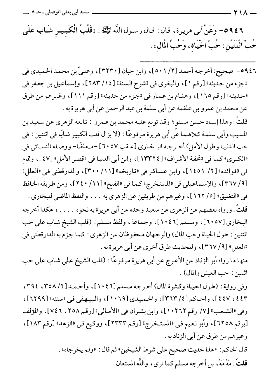 ٥٩٤٦ - وَعَنْ أبي هريرة، قال: قال رسول الله - صلى الله عليه وسلم -: "قَلْبُ الْكَبِيرِ شَابَ عَلَى حُبِّ اثْنَتَيْنِ: حُبِّ الحيَاةِ، وَحُبِّ المالِ".