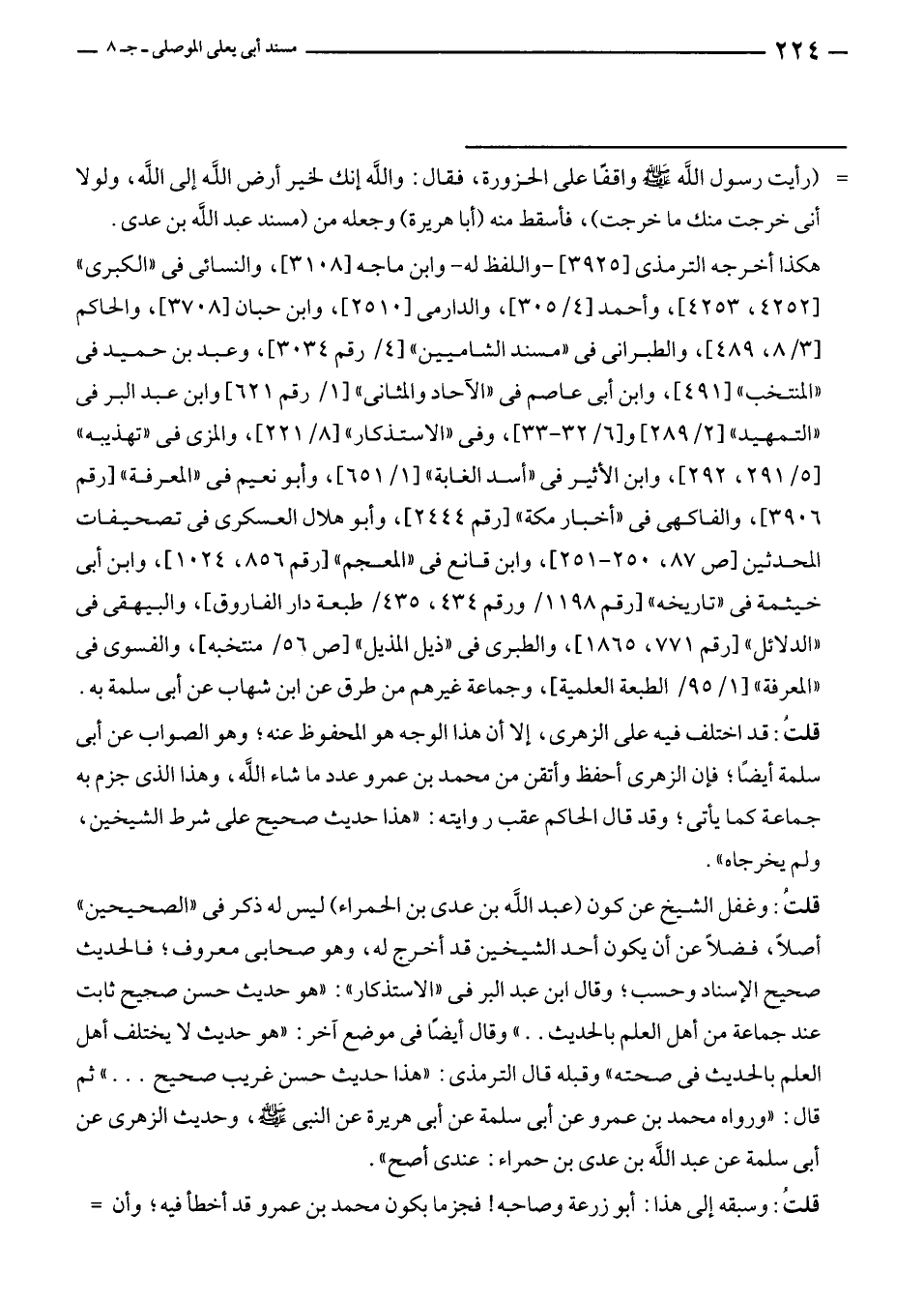 = رأيت رسول الله - صلى الله عليه وسلم - واقفًا على الحزورة، فقال: واللَّه إنك لخير أرض الله إلى الله، ولو لا أنى خرجت منك ما خرجت)، فأسقط منه (أبا هريرة) وجعله من (مسند عبد الله بن عدي).