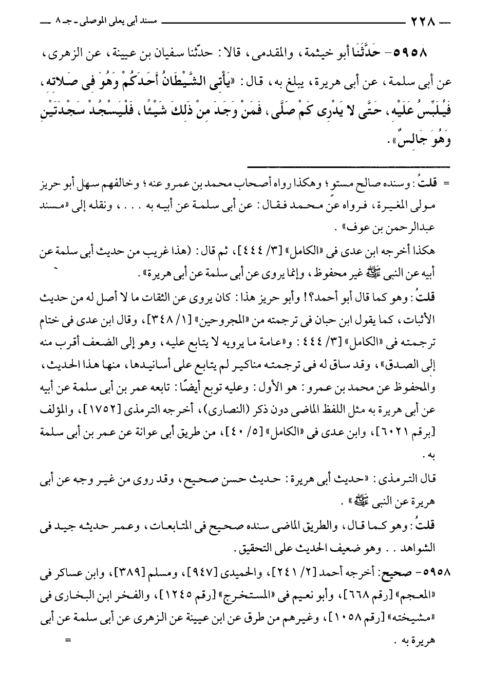 ٥٩٥٨ - حَدَّثَنَا أبو خيثمة، والمقدمى، قالا: حدّثنا سفيان بن عيينة، عن الزهري، عن أبي سلمة، عن أبي هريرة، يبلغ به، قال: "يَأْتِى الشَّيْطَانُ أَحَدَكُمْ وَهُوَ فِي صَلاتِهِ، فَيُلَبِّسُ عَلَيْهِ، حَتَّى لا يَدْرِى كَمْ صَلَّى، فَمَنْ وَجَدَ مِن ذَلِكَ شَيْئًا، فَلْيَسْجُدْ سَجْدَتيْنِ وَهُوَ جَالِسٌ".