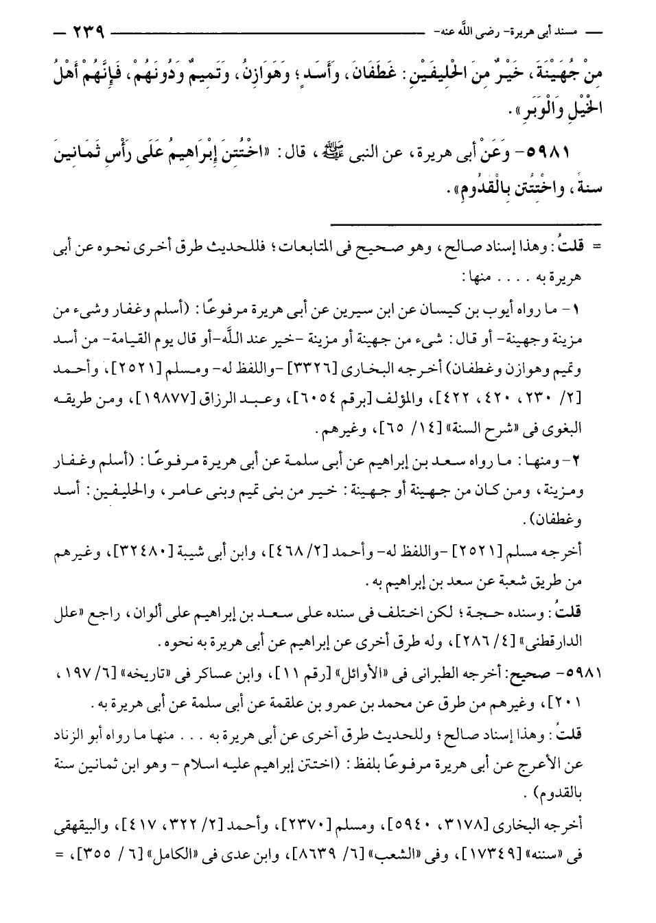 ٥٩٨١ - وَعَنْ أبى هريرة، عن النبي - صلى الله عليه وسلم -، قال: "اخْتُتِنَ إِبْرَاهِيمُ عَلَى رَأْسِ ثَمَانِينَ سنةً، واخُتِتُن بِالقدُومِ".