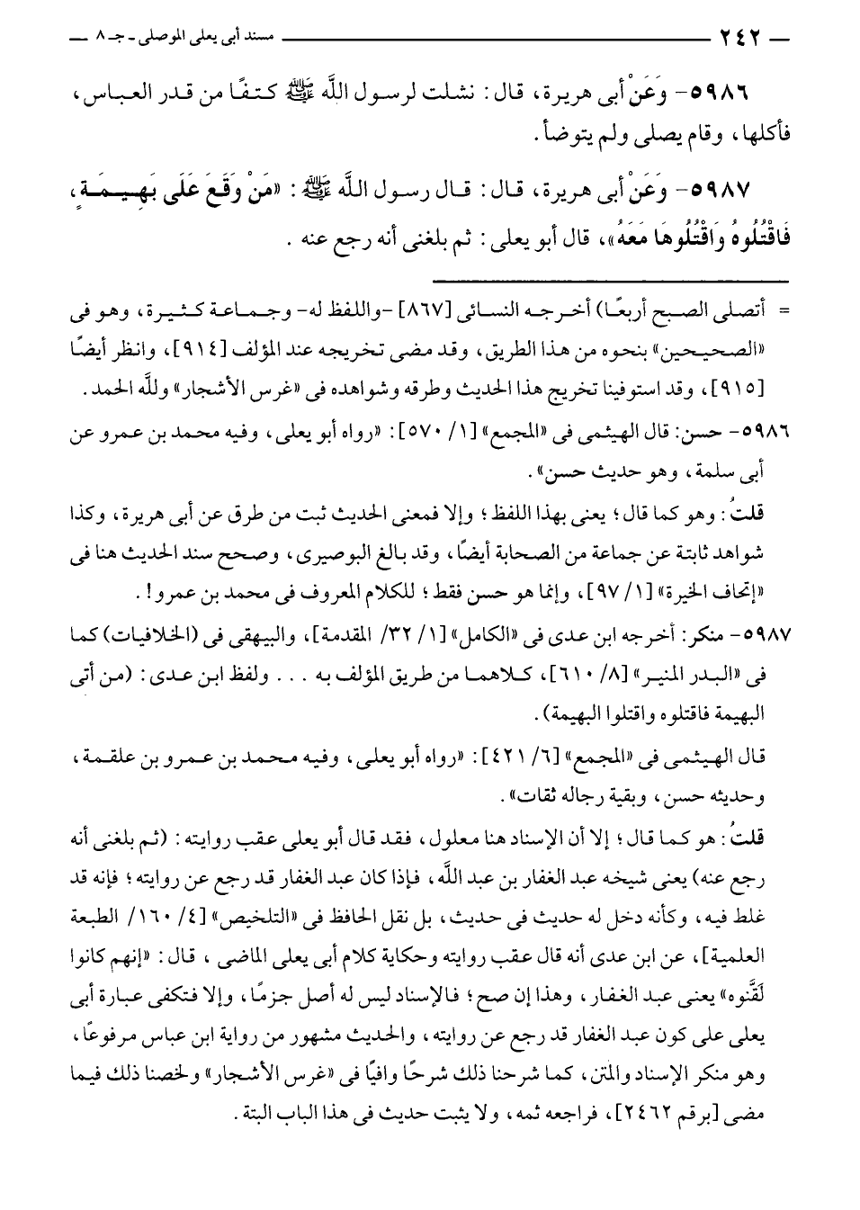 ٥٩٨٧ - وَعَنْ أبى هريرة، قال: قال رسول الله - صلى الله عليه وسلم -: "مَنْ وَقَعَ عَلَى بَهِيمَةٍ، فَاقْتُلُوهُ وَاقْتُلُوهَا مَعَهُ"، قال أبو يعلى: ثم بلغنى أنه رجع عنه.