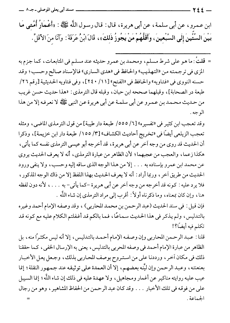 وقد تعجب ابن كثير في "تفسيره" [٦/ ٥٥٥/ طبعة دار طيبة] من قول الترمذى الماضى، ومثله تعجب الزيلعى أيضًا في "تخريج أحاديث الكشاف" [٣/ ١٥٥/ طبعة دار ابن خزيمة]، وذكرا أن الحديث قد روى من وجه آخر عن أبى هريرة، قد أخرجه أبو عيسى الترمذى نفسه كما يأتى، هكذا زعما، والعجب من عجبهما؛ لأن الظاهر من عبارة الترمذى، أنه لا يعرف الحديث يروى عن محمد بن عمرو بإسناده به ... إلا من هذا الوجه الذي ساقه إليه وحسب، ولا ينفى ورود الحديث من طريق آخر، وربما أراد: أنه لا يعرف الحديث بهذا اللفظ إلا من ذاك الوجه المذكور، فلا يرد عليه: كونه قد أخرجه من وجه آخر عن أبى هريرة - كما يأتى - به ... ، لأنه دون لفظه هنا، وإن كان بمعناه، وما ذكرناه أولًا: أقرب إلى مراد الترمذى إن شاء الله.