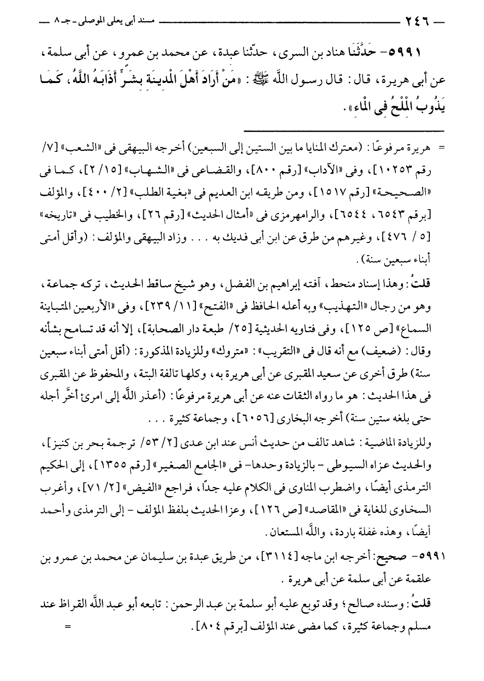 ٥٩٩١ - حَدَّثَنَا هناد بن السرى، حدّثنا عبدة، عن محمد بن عمرٍو، عن أبى سلمة، عن أبى هريرة، قال: قال رسول الله - صلى الله عليه وسلم -: "مَنْ أَرَادَ أَهْلَ الْمَدِينَةِ بِشَرٍّ أَذَابَهُ اللهُ، كَمَا يَذُوبُ الْمِلْحُ فِي الْمَاءِ".