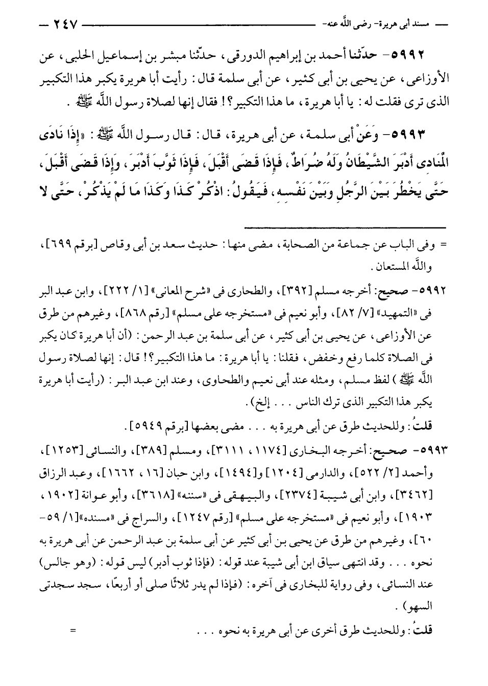 ٥٩٩٢ - حدّثنا أحمد بن إبراهيم الدورقى، حدّثنا مبشر بن إسماعيل الحلبى، عن الأوزاعى، عن يحيى بن أبى كثير، عن أبى سلمة قال: رأيت أبا هريرة يكبر هذا التكبير الذي ترى فقلت له: يا أبا هريرة، ما هذا التكبير؟! فقال إنها لصلاة رسول الله - صلى الله عليه وسلم -.