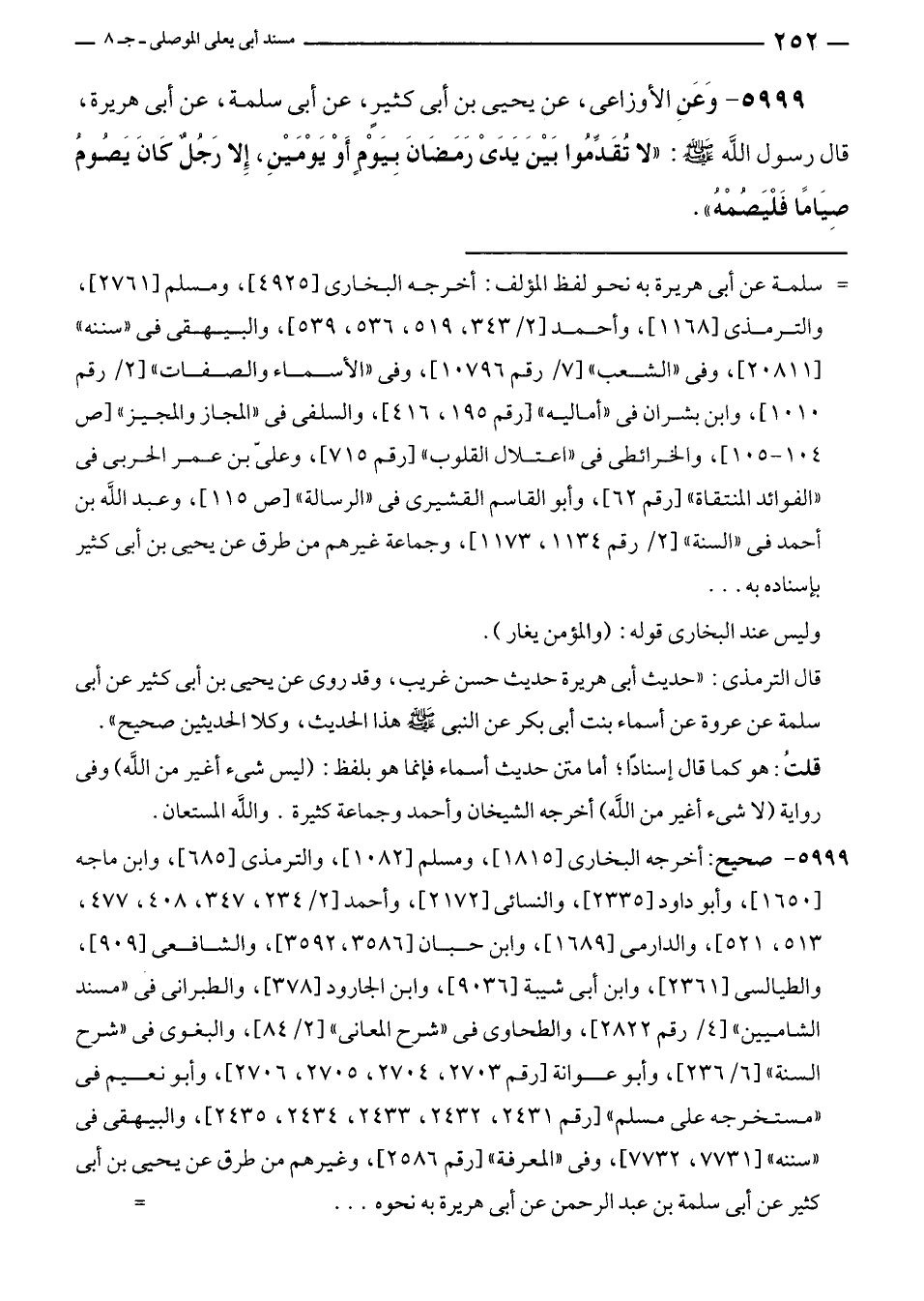 ٥٩٩٩ - وَعَنِ الأوزاعى، عن يحيى بن أبى كثيرٍ، عن أبى سلمة، عن أبى هريرة، قال رسول الله - صلى الله عليه وسلم -: "لا تُقَدِّمُوا بَيْنَ يَدَىْ رَمَضَانَ بِيَوْمٍ أَوْ يَوْمَيْنِ، إِلا رَجُلٌ كَانَ يَصُومُ صِيَامًا فَلْيَصُمْهُ".