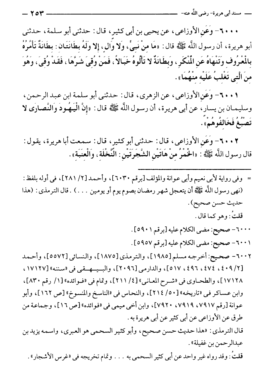 ٦٠٠٢ - صحيح: أخرجه مسلم [١٩٨٥]، والترمذى [١٨٧٥]، والنسائى [٥٥٧٢]، وأحمد [٢/ ٤٠٩، ٤٧٤، ٤٩٦، ٥١٧]، والدارمى [٢٠٩٦]، والبيهقى في "سننه" [١٧١٢٧، ١٧١٢٨]، والطحاوى في "شرح المعانى" [٤/ ٢١١]، وتمام في "فوائده" [١/ رقم ٨٣٠]، وابن عساكر في "تاريخه" [٥٠/ ٢١٤]، والنحاس في "الناسخ والمنسوخ" [ص ١٦٢]، وأبو عوانة [رقم ٧٩١٧، ٧٩١٩، ٧٩٢٠]، وابن أخى ميمى في "فوائده" [ص ١٦]، وجماعة من طرق عن الأوزاعى عن أبى كثير عن أبى هريرة به.