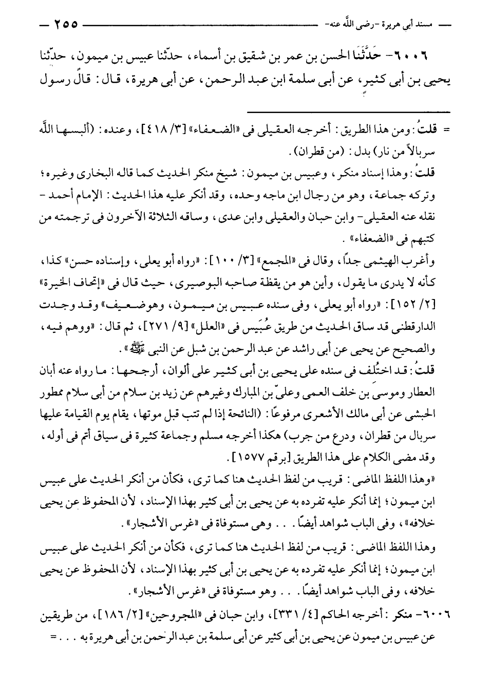 ٦٠٠٦ - حَدَّثَنَا الحسن بن عمر بن شقيق بن أسماء، حدّثنا عبيس بن ميمونٍ، حدّثنا يحيى بن أبى كثيرٍ، عن أبى سلمة بن عبد الرحمن، عن أبى هريرة، قال: قال رسول