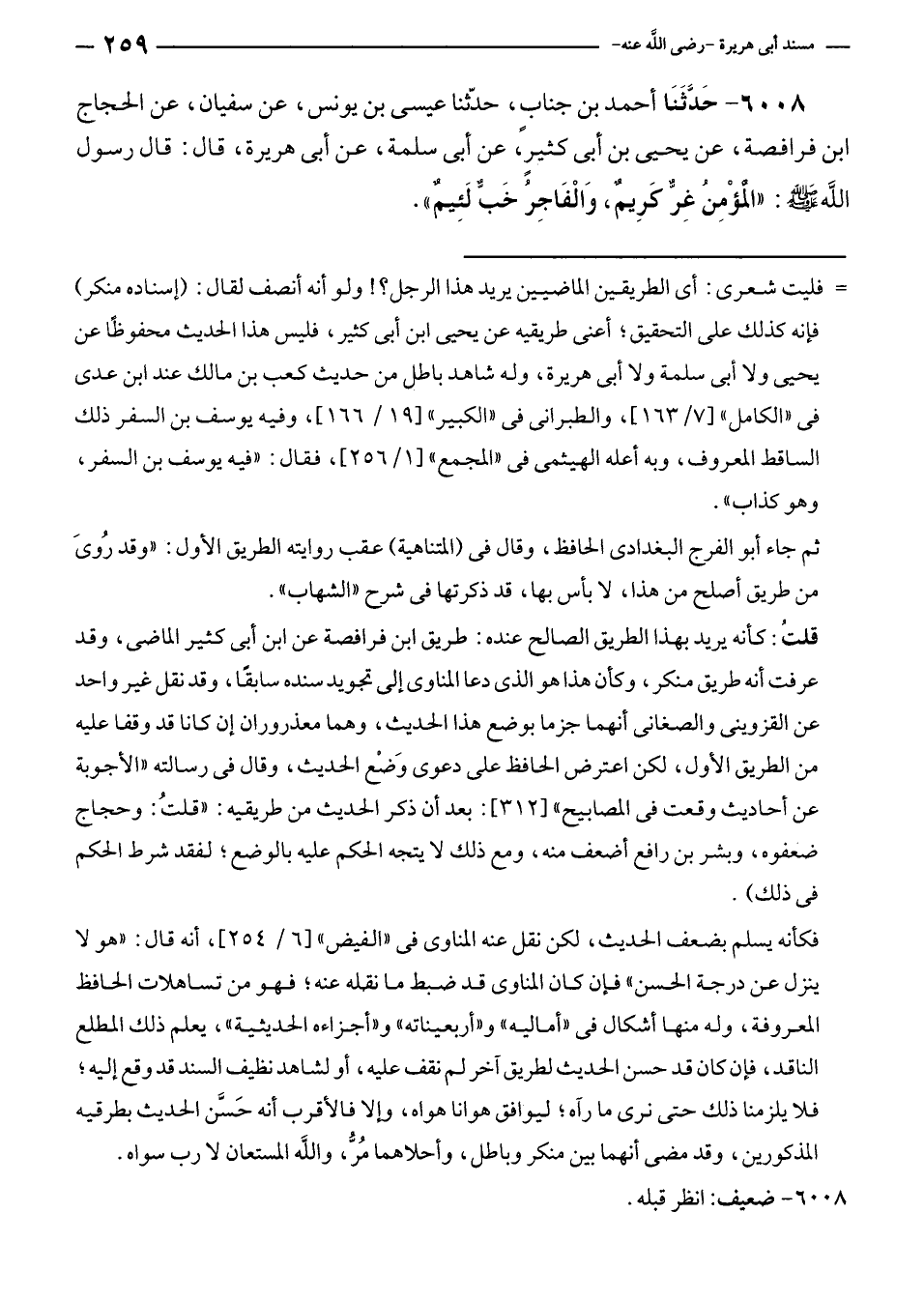 ٦٠٠٨ - حَدَّثَنَا أحمد بن جنابٍ، حدّثنا عيسى بن يونس، عن سفيان، عن الحجاج بن فرافصة، عن يحيى بن أبى كثيرٍ، عن أبى سلمة، عن أبى هريرة، قال: قال رسول الله - صلى الله عليه وسلم -: "الْمؤْمِنُ غِرٌّ كَرِيمٌ، وَالْفَاجِرُ خَبٌّ لَئِيمٌ".