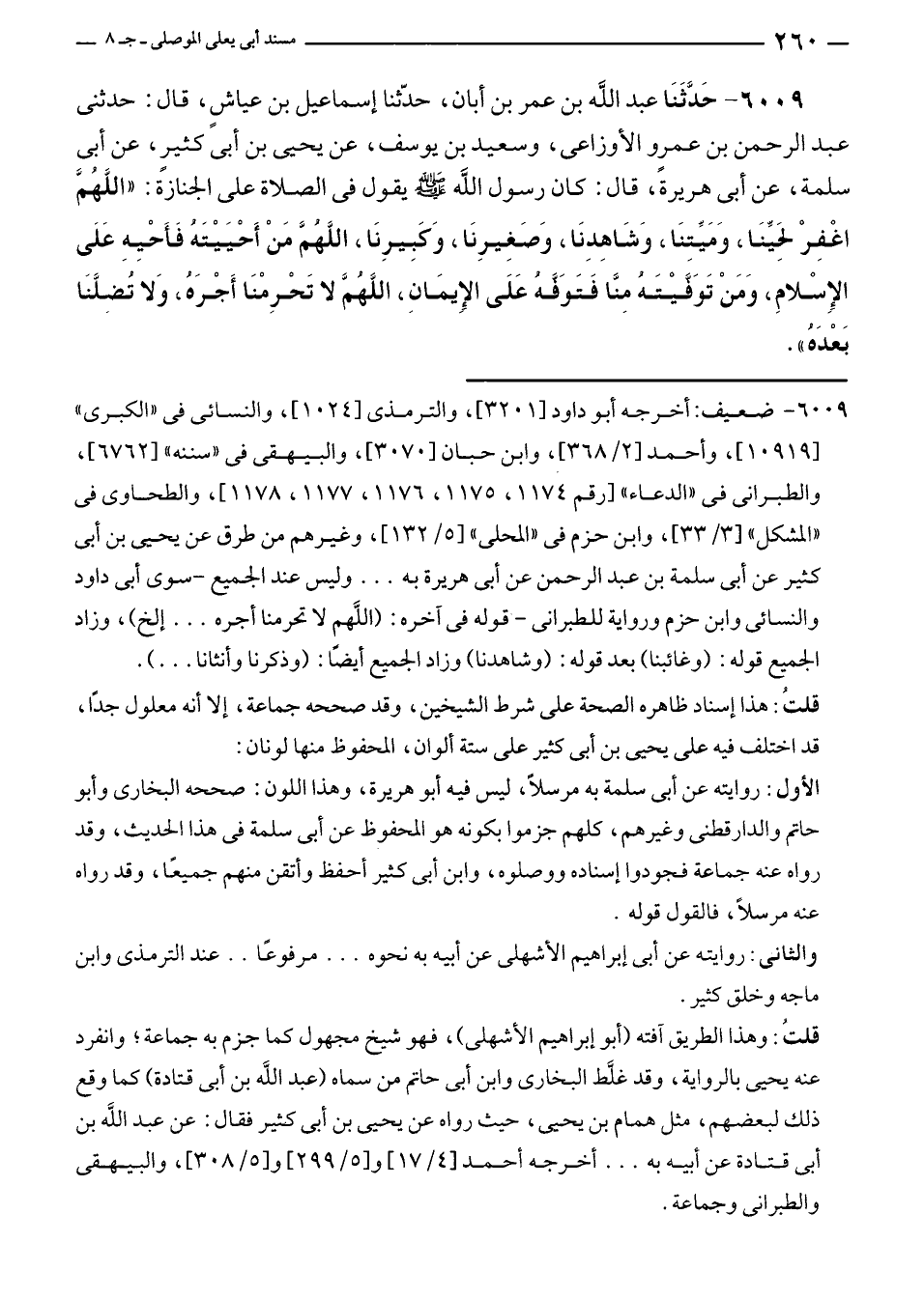 ٦٠٠٩ - حَدَّثَنَا عبد الله بن عمر بن أبان، حدّثنا إسماعيل بن عياشٍ، قال: حدثنى عبد الرحمن بن عمرٍو الأوزاعى، وسعيد بن يوسف، عن يحيى بن أبي كثيرٍ، عن أبى سلمة، عن أبى هريرة، قال: كان رسول الله - صلى الله عليه وسلم - يقول في الصلاة على الجنازة: "اللَّهُمَّ اغْفِرْ لحِيِّنَا، وَمَيِّتِنَا، وَشَاهِدِنَا، وَصَغِيرِنَا، وَكَبِيرِنَا، اللَّهُمَّ مَنْ أَحْيَيْتَهُ فَأَحْيِهِ عَلَى اِلإِسْلامِ، وَمَنْ تَوَفَّيْتَهُ مِنَّا فَتَوَفَّهُ عَلَى الإِيمَانِ، اللَّهُمَّ لا تَحْرِمْنَا أَجْرَهُ، وَلا تُضِلَّنَا بعدهُ".