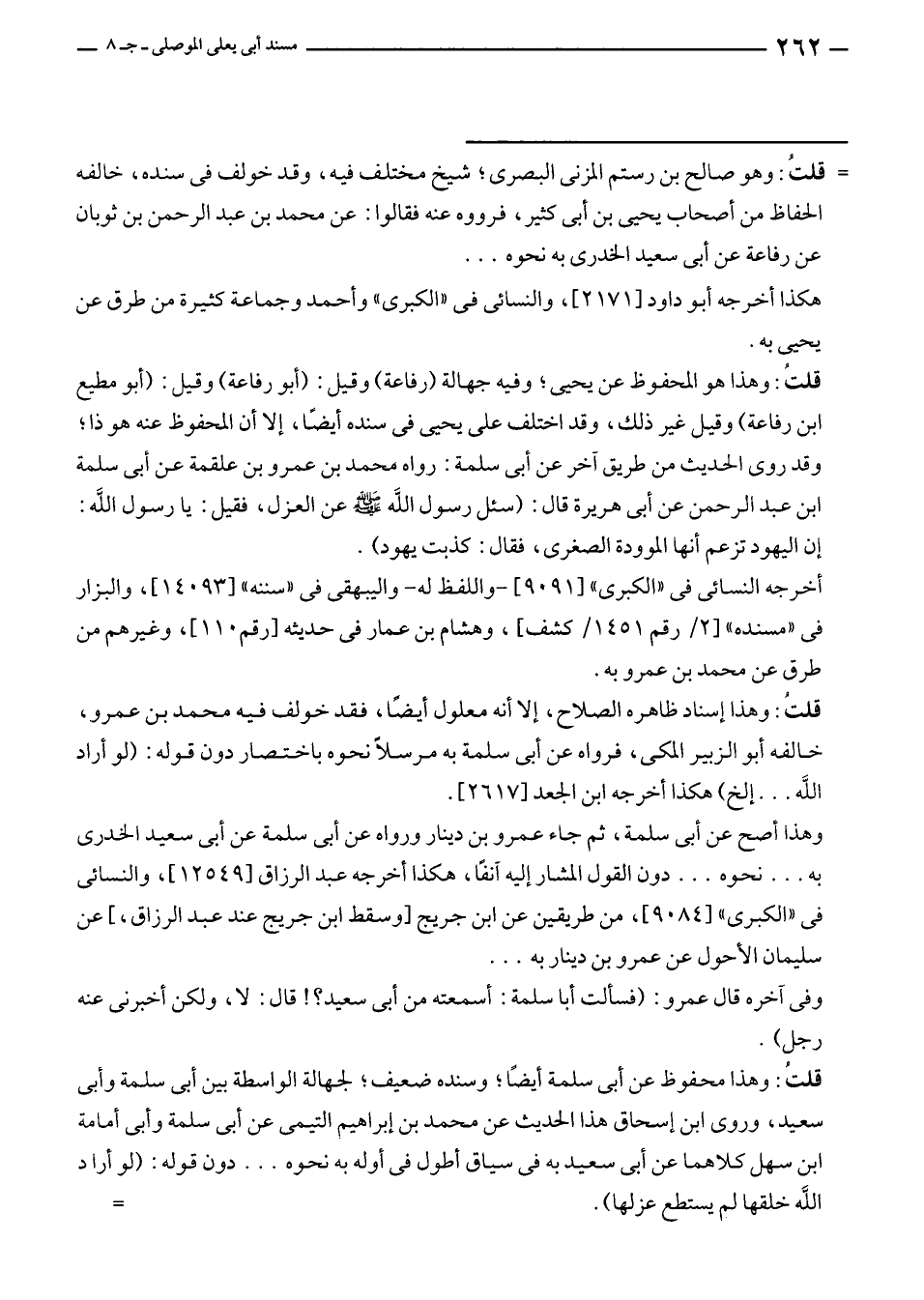 قلتُ: وهذا هو المحفوظ عن يحيى؛ وفيه جهالة (رفاعة) وقيل: (أبو رفاعة) وقيل: (أبو مطيع بن رفاعة) وقيل غير ذلك، وقد اختلف على يحيى في سنده أيضًا، إلا أن المحفوظ عنه هو ذا؛ وقد روى الحديث من طريق آخر عن أبى سلمة: رواه محمد بن عمرو بن علقمة عن أبى سلمة بن عبد الرحمن عن أبى هريرة قال: (سئل رسول الله - صلى الله عليه وسلم - عن العزل، فقيل: يا رسول الله: إن اليهود تزعم أنها الموودة الصغرى، فقال: كذبت يهود).