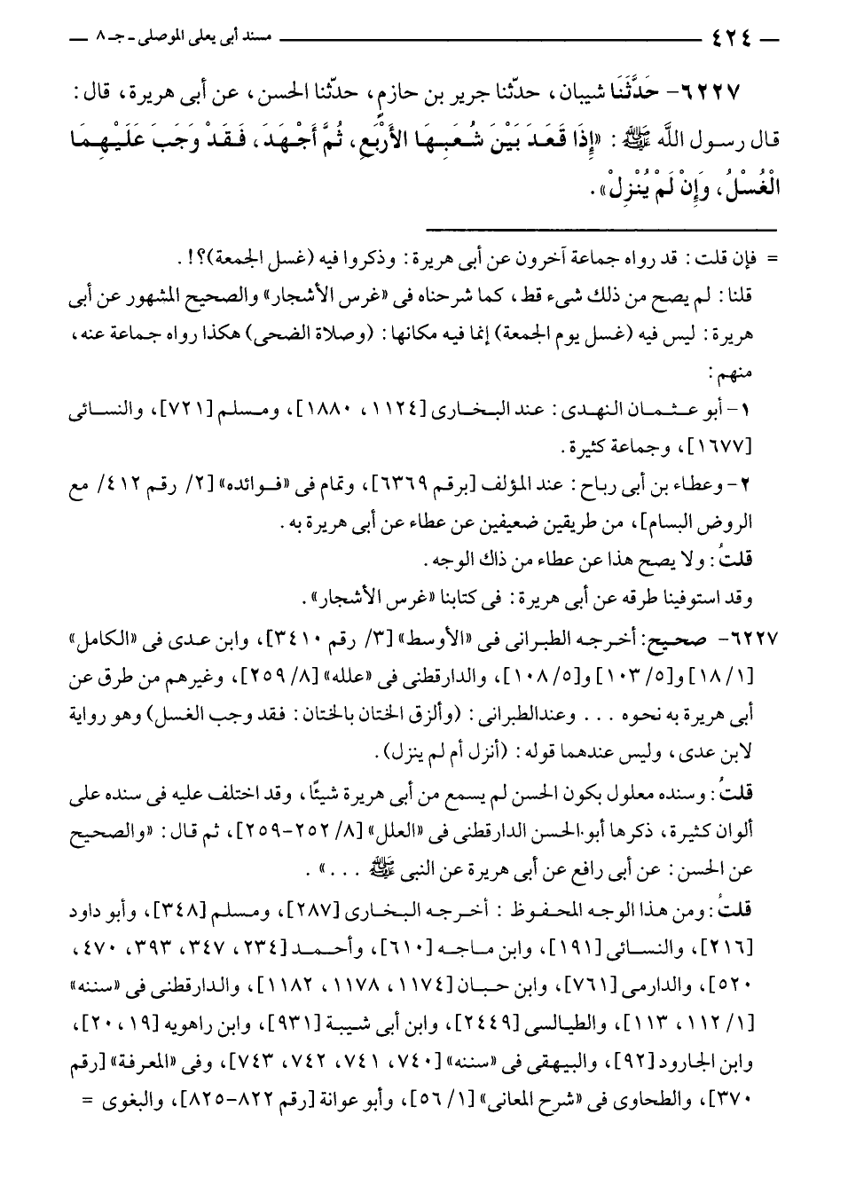 ٦٢٢٧ - حَدَّثَنَا شيبان، حَدَّثَنَا جرير بن حازمٍ، حَدَّثَنَا الحسن، عن أبى هريرة، قال: قال رسول الله - صلى الله عليه وسلم -: "إذَا قَعَدَ بَيْنَ شُعَبِهَا الأَرْبعِ، ثُمَّ أَجْهَدَ، فَقَدْ وَجَبَ عَلَيْهِمَا الْغُسْلُ، وَإن لَمْ يُنْزِلْ".