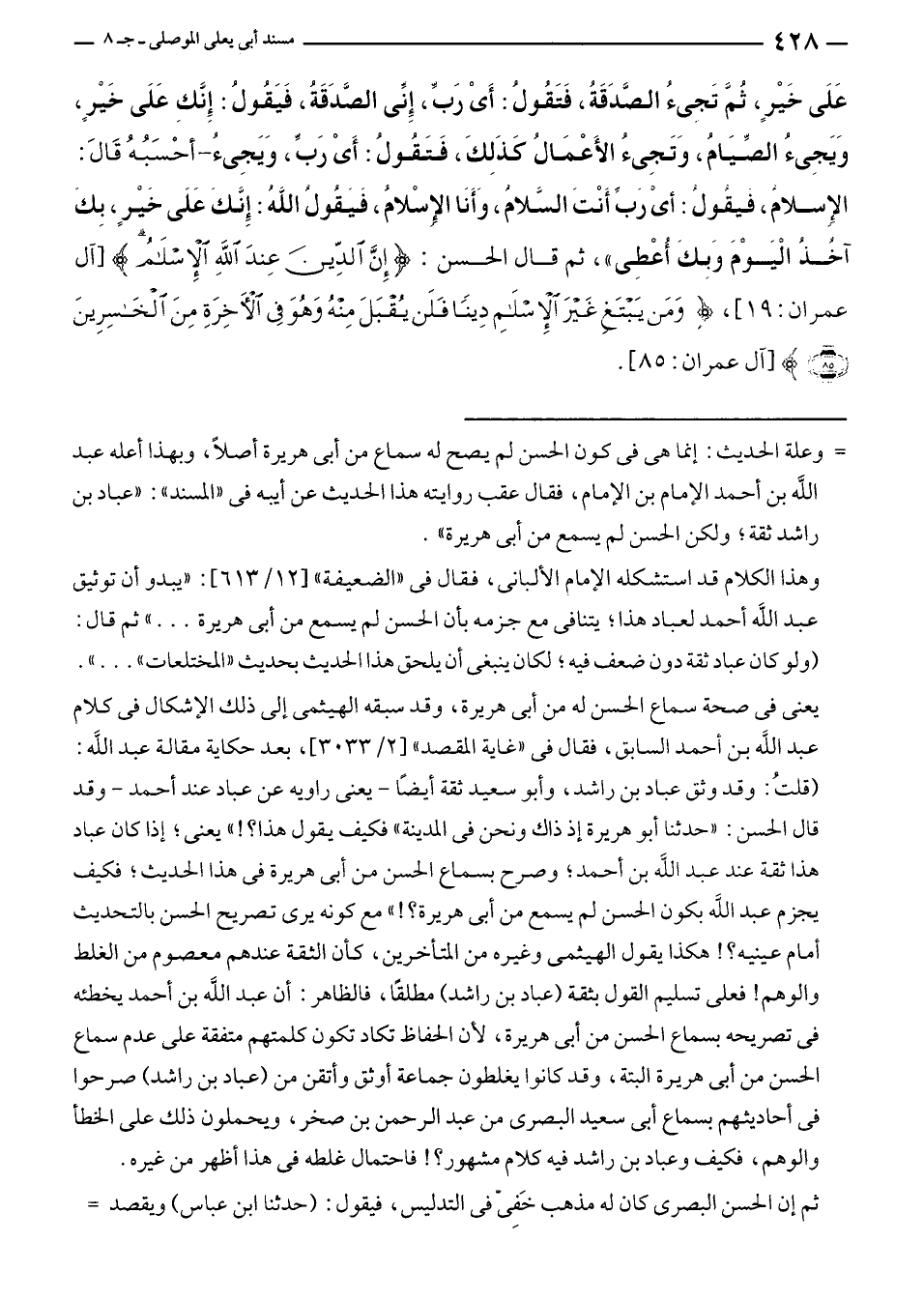 = وعلة الحديث: إنما هي في كون الحسن لم يصحّ له سماع من أبى هريرة أصلًا، وبهذا أعله عبد الله بن أحمد الإمام بن الإمام، فقال عقب روايته هذا الحديث عن أيبه في "المسند": "عباد بن راشد ثقة؛ ولكن الحسن لم يسمع من أبى هريرة".