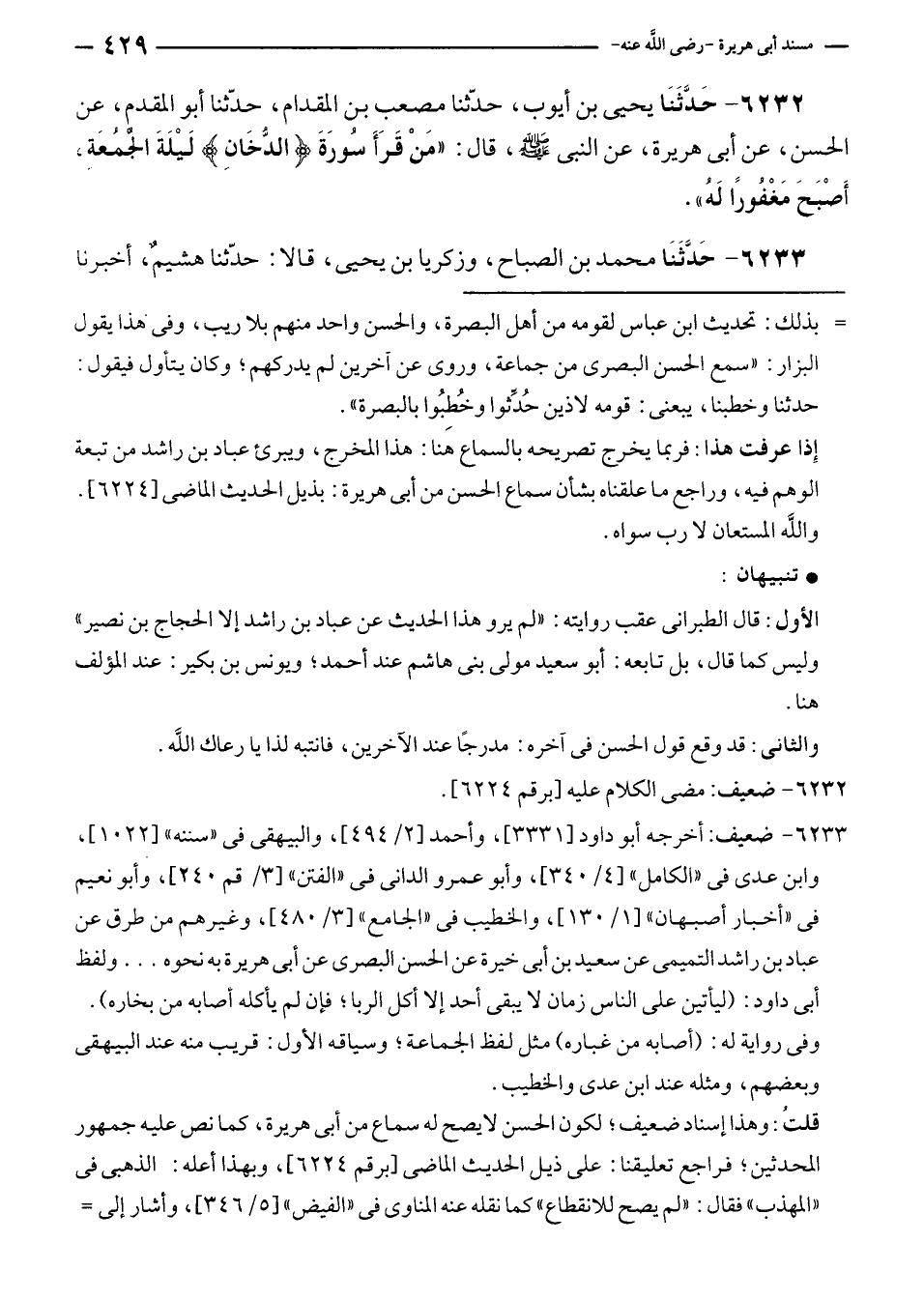 ٦٢٣٢ - حَدَّثَنَا يحيى بن أيوب، حَدَّثَنَا مصعب بن المقدام، حَدَّثَنَا أبو المقدم، عن الحسن، عن أبى هريرة، عن النَّبِيّ - صلى الله عليه وسلم -، قال: "مَنْ قَرَأَ سُورَةَ {الدُخَانِ} هو لَيْلَةَ الجمُعَة, أَصْبَحَ مَغْفُورًا لَهُ".