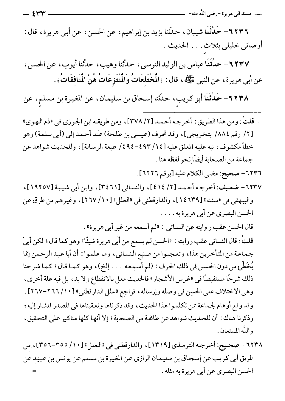 قلتُ: قال النسائي عقب روايته: "الحسن لم يسمع من أبى هريرة شيئًا" وهو كما قال؛ لكن أبىَ جماعة من المتأخرين هذا، وتعجبوا من صنيع النسائي، وما علموا: أن أبا عبد الرحمن إنما يُخَطِّئ من دون الحسن في ذلك الحرف: (لم أسمعه ... إلخ)، وهو كما قال؛ كما شرحنا ذلك شرحًا مستفيضًا في "غرس الأشجار" فالحديث معل بالانقطاع ولا بد، بل فيه علة أخرى، وهى الاختلاف على الحسبن في وصله وإرساله، فراجع "علل الدارقطنى" [١٠/ ٢٦٦ - ٢٦٧].