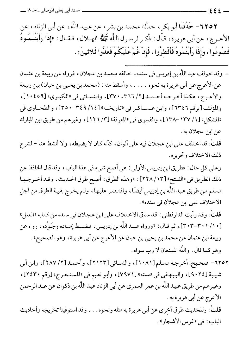 ٦٢٥٢ - حَدَّثَنَا أبو بكرٍ، حدّثنا محمد بن بشر، عن عبيد الله، عن أبي الزناد، عن الأعرج، عن أبي هريرة، قال: ذُكر لرسول الله - صلى الله عليه وسلم - الهلال، فقال: "إِذَا رَأَيتُمُوه فَصُومُوا، وَإِذَا رَأَيْتُمُوهُ فَأَفْطرُوا، فَإِنْ غُمَّ عَلَيْكُمْ فَعُدُّوا ثَلاثينَ".