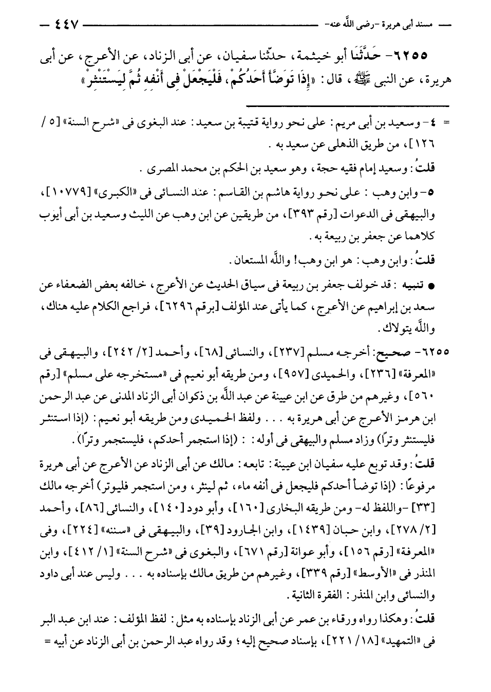 ٦٢٥٥ - صحيح: أخرجه مسلم [٢٣٧]، والنسائى [٦٨]، وأحمد [٢/ ٢٤٢]، والبيهقى في "المعرفة" [٢٣٦]، والحميدى [٩٥٧]، ومن طريقه أبو نعيم في "مستخرجه على مسلم" [رقم ٥٦٠]، وغيرهم من طرق عن ابن عيينة عن عبد الله بن ذكوان أبي الزناد المدنى عن عبد الرحمن بن هرمز الأعرج عن أبي هريرة به ... ولفظ الحميدى ومن طريقه أبو نعيم: (إذا استنثر فليستنثر وترًا) وزاد مسلم والبيهقى في أوله:: (إذا استجمر أحدكم، فليستجمر وترًا).