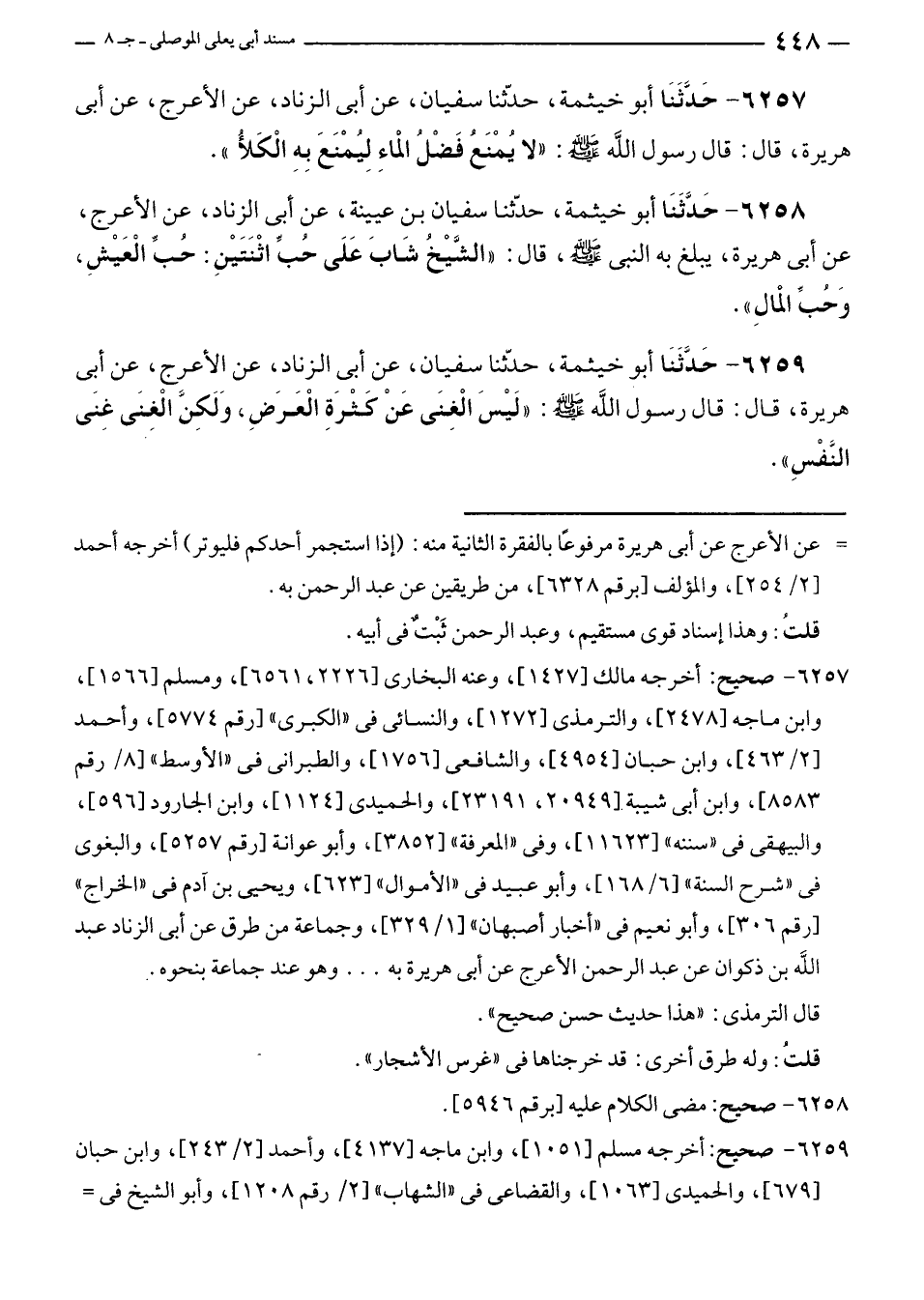 ٦٢٥٧ - صحيح: أخرجه مالك [١٤٢٧]، وعنه البخارى [٢٢٢٦ , ٦٥٦١]، ومسلم [١٥٦٦]، وابن ماجه [٢٤٧٨]، والترمذى [١٢٧٢]، والنسائى في "الكبرى" [رقم ٥٧٧٤]، وأحمد [٢/ ٤٦٣]، وابن حبان [٤٩٥٤]، والشافعي [١٧٥٦]، والطبرانى في "الأوسط" [٨/ رقم ٨٥٨٣]، وابن أبي شيبة [٢٠٩٤٩ , ٢٣١٩١]، والحميدى [١١٢٤]، وابن الجارود [٥٩٦]، والبيهقى في "سننه" [١١٦٢٣]، وفى "المعرفة" [٣٨٥٢]، وأبو عوانة [رقم ٥٢٥٧]، والبغوى في "شرح السنة" [٦/ ١٦٨]، وأبو عبيد في "الأموال" [٦٢٣]، ويحيى بن آدم في "الخراج" [رقم ٣٠٦]، وأبو نعيم في "أخبار أصبهان" [١/ ٣٢٩]، وجماعة من طرق عن أبي الزناد عبد الله بن ذكوان عن عبد الرحمن الأعرج عن أبي هريرة به ... وهو عند جماعة بنحوه.
