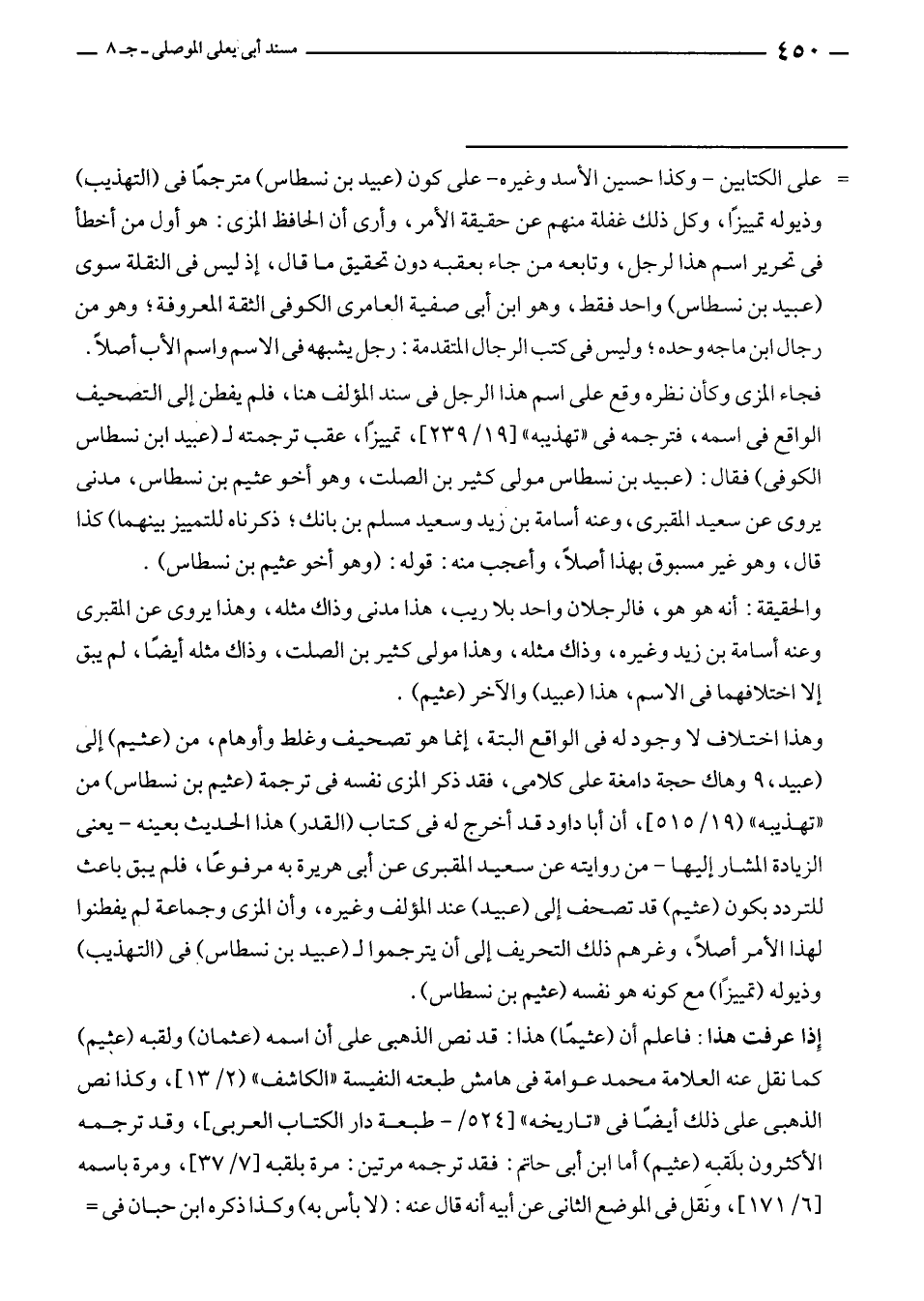وهذا اختلاف لا وجود له في الواقع البتة، إنما هو تصحيف وغلط وأوهام، من (عثيم) إلى (عبيد) وهاك حجة دامغة على كلامى، فقد ذكر المزى نفسه في ترجمة (عثيم بن نسطاس) من "تهذيبه" [١٩/ ٥١٥]، أن أبا داود قد أخرج له في كتاب (القدر) هذا الحديث بعينه - يعنى الزيادة المشار إليها - من روايته عن سعيد القبرى عن أبي هريرة به مرفوعًا، فلم يبق باعث للتردد بكون (عثيم) قد تصحف إلى (عبيد) عند المؤلف وغيره، وأن المزى وجماعة لم يفطنوا لهذا الأمر أصلًا، وغرهم ذلك التحريف إلى أن يترجموا لـ (عبيد بن نسطاس) في (التهذيب) وذيوله (تمييزًا) مع كونه هو نفسه (عثيم بن نسطاس).
