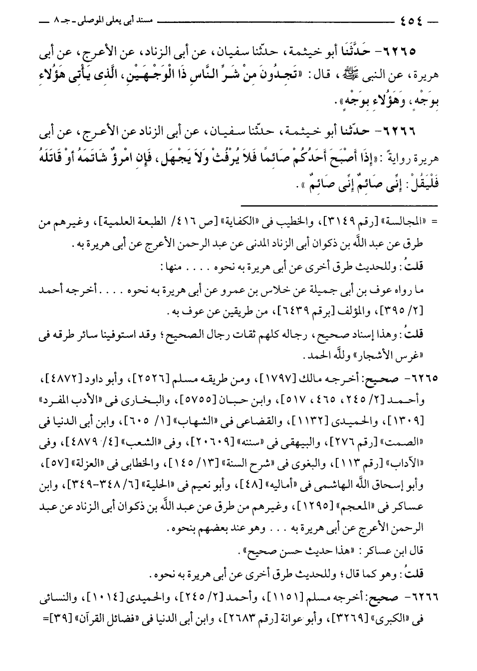 ٦٢٦٦ - حدّثنا أبو خيثمة، حدّثنا سفيان، عن أبي الزناد عن الأعرج، عن أبي هريرة روايةً: "إِذَا أَصْبَحَ أَحَدُكُمْ صَائِمًا فَلا يُرْفُثْ وَلا يَجْهَل، فَإِنِ امْرؤٌ شَاتَمَهُ أوْ قَاتَلَهُ فَلْيَقَلْ: إِنِّي صَائِمٌ إِنِّي صَائِمٌ".