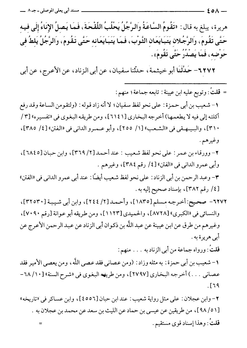 ٢ - وورقاء بن عمر: على نحو لفظ شعيب: عند أحمد [٢/ ٣٦٩]، وابن حبان [٦٨٤٥]، وأبى عمرو الدانى في "الفتن" [٤/ رقم ٣٨٤]، وغيرهم.