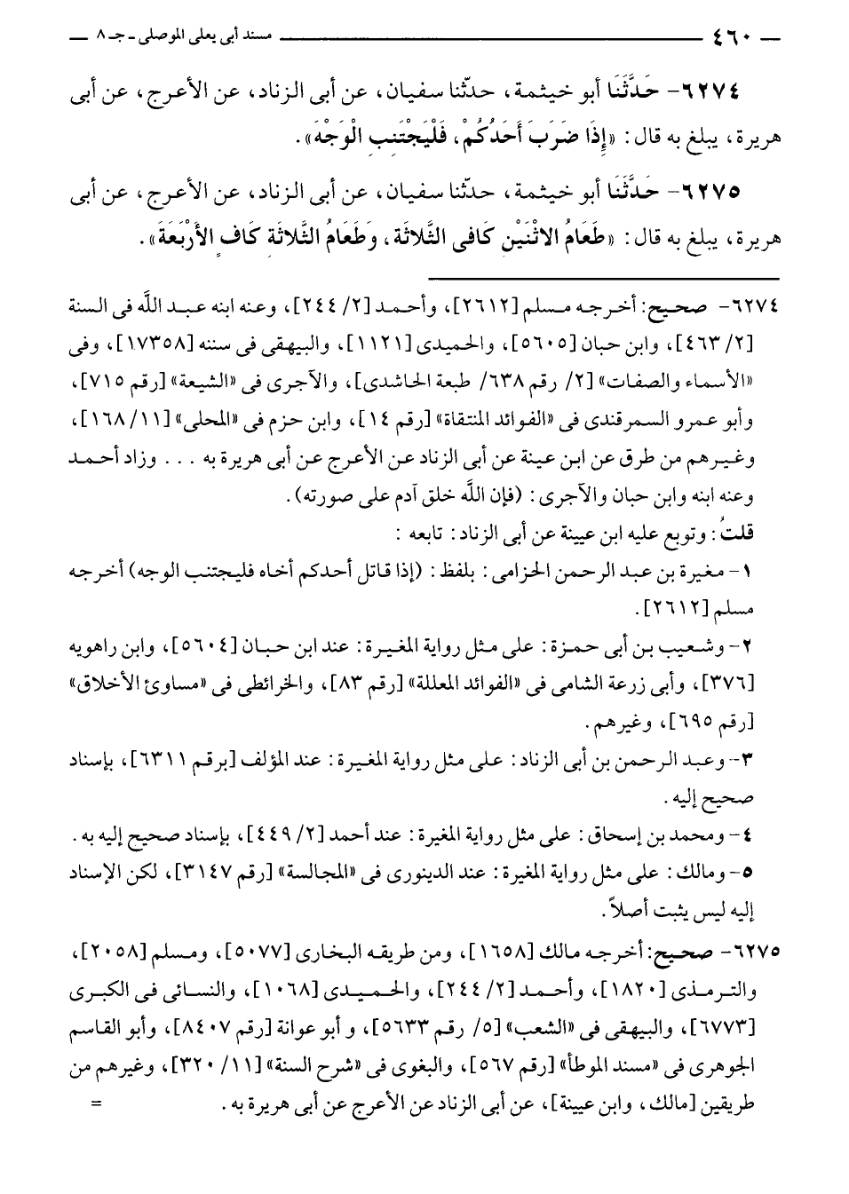 ٦٢٧٤ - صحيح: أخرجه مسلم [٢٦١٢]، وأحمد [٢/ ٢٤٤]، وعنه ابنه عبد الله في السنة [٢/ ٤٦٣]، وابن حبان [٥٦٠٥]، والحميدى [١١٢١]، والبيهقى في سننه [١٧٣٥٨]، وفى "الأسماء والصفات" [٢/ رقم ٦٣٨/ طبعة الحاشدى]، والآجرى في "الشيعة" [رقم ٧١٥]، وأبو عمرو السمرقندى في "الفوائد المنتقاة" [رقم ١٤]، وابن حزم في "المحلى" [١١/ ١٦٨]، وغيرهم من طرق عن ابن عينة عن أبي الزناد عن الأعرج عن أبي هريرة به ... وزاد أحمد وعنه ابنه وابن حبان والآجرى: (فإن الله خلق آدم على صورته).