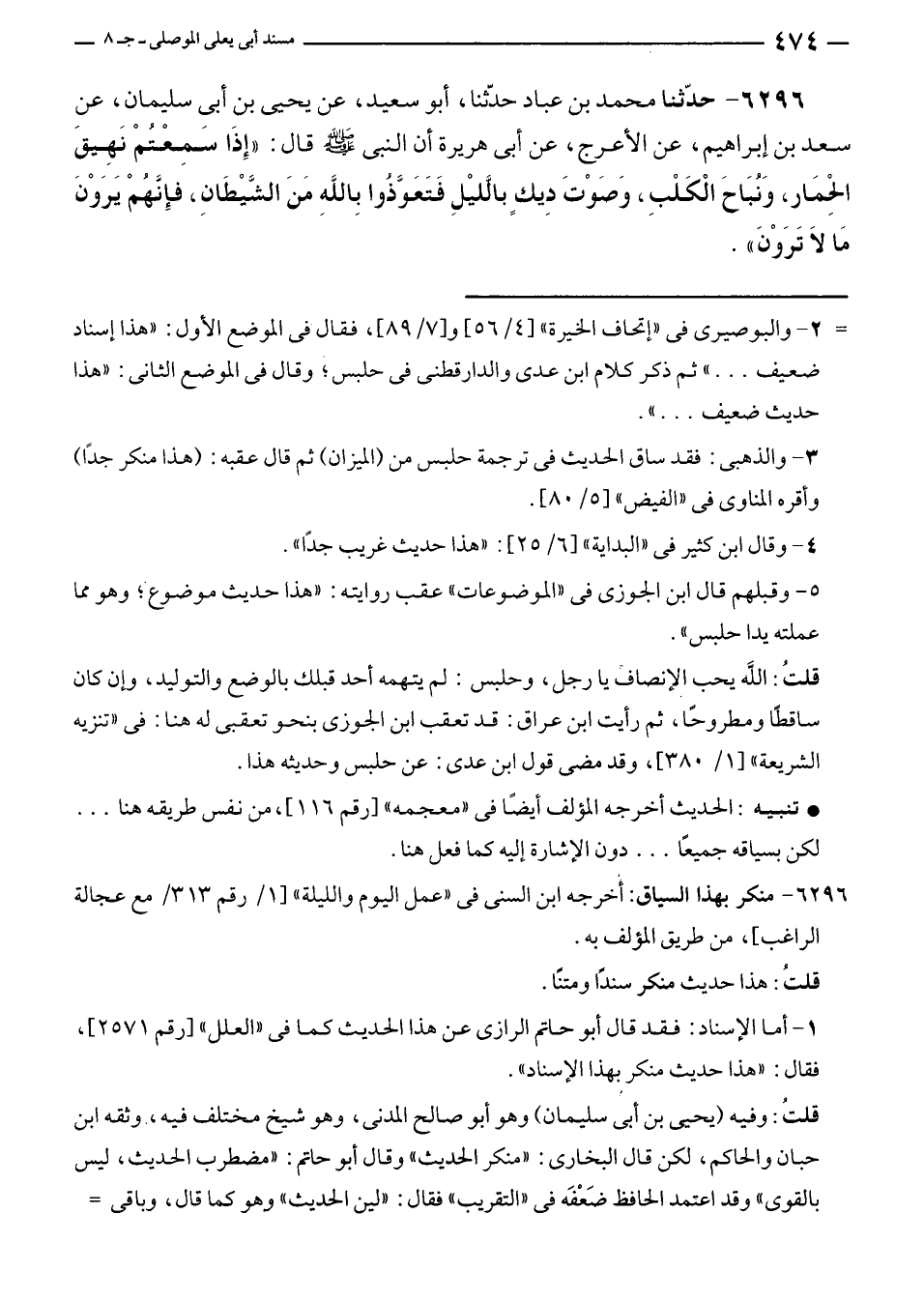 = ٢ - والبوصيرى في "إتحاف الخيرة" [٤/ ٥٦] و [٧/ ٨٩]، فقال في الموضع الأول: "هذا إسناد ضعيف ... " ثم ذكر كلام ابن عدى والدارقطنى في حلبس، وقال في الموضع الثاني: "هذا حديث ضعيف ... ".