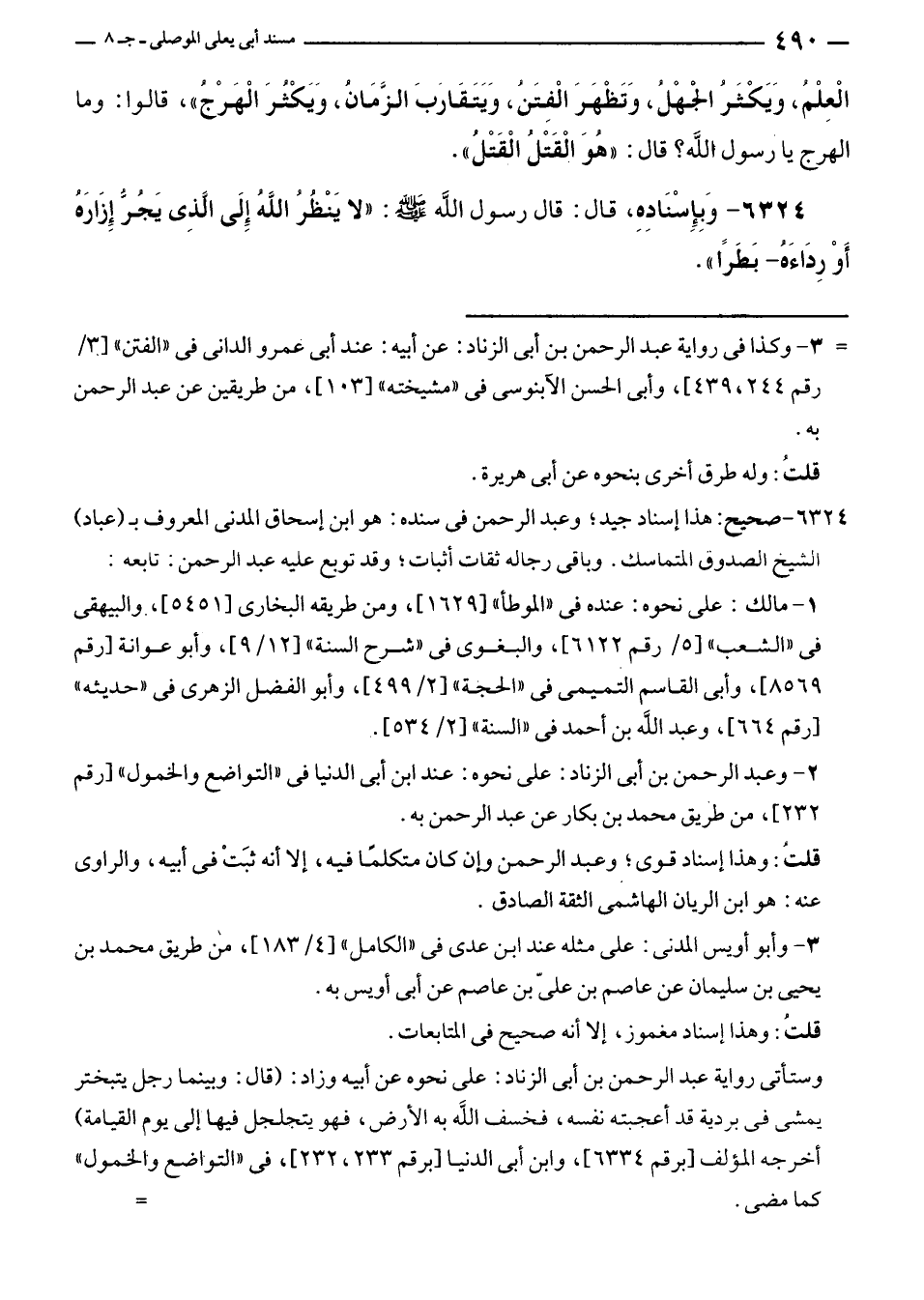 ٦٣٢٤ - وَبِإِسنَادِهِ، قال: قال رسول الله - صلى الله عليه وسلم -: "لا يَنْظُرُ اللَّهُ إِلَى الَّذِي يَجُرُّ إِزَارَهُ أَوْ رِدَاءَهُ - بَطَرًا".