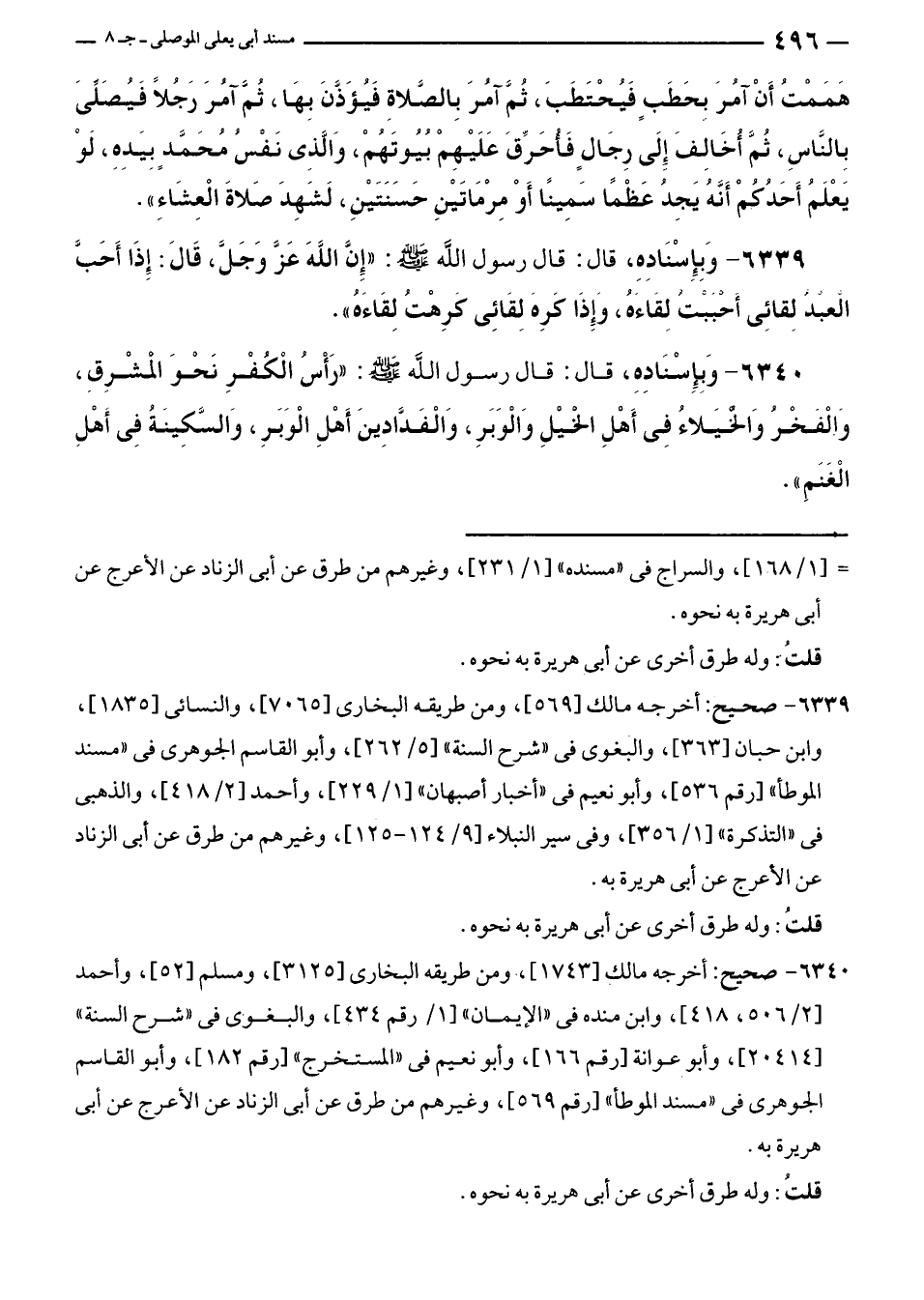 ٦٣٣٩ - وَبإِسْنَادِهِ، قال: قال رسول الله - صلى الله عليه وسلم -: "إِنَّ اللَّهَ عَزَّ وَجَلَّ، قَالَ: إِذَا أَحَبَّ الْعبْدُ لِقائِى أَحْبَبَتُ لِقَاءَهُ، وَإِذَا كَرِهَ لِقَائِى كَرِهْتُ لِقَاءَهُ".