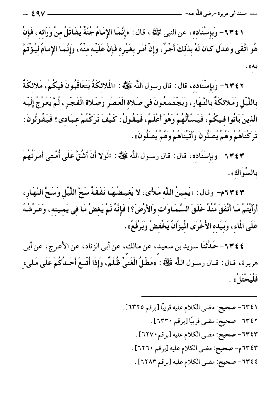 ٦٣٤٣ م - وقال: "يَمِينُ اللَّهِ مَلأَى، لا يَغِيضُهَا نَفَقَةٌ سَحَّ اللَّيْلِ وَسَحَّ النَّهَارِ، أَرَأَيْتُمْ مَا أَنْفَقَ مُنْذُ خَلَقَ السَّمَاوَاتِ وَالأَرْضَ؟! فَإِنَّهُ لَمْ يَغِضْ مَا فِي يَمِينِهِ، وَعَرْشُهُ عَلَى الماءِ، وَبِيَدِهِ الأُخْرَى الْمِيزَانُ يَخْفِضُ وَيَرْفَعُ".