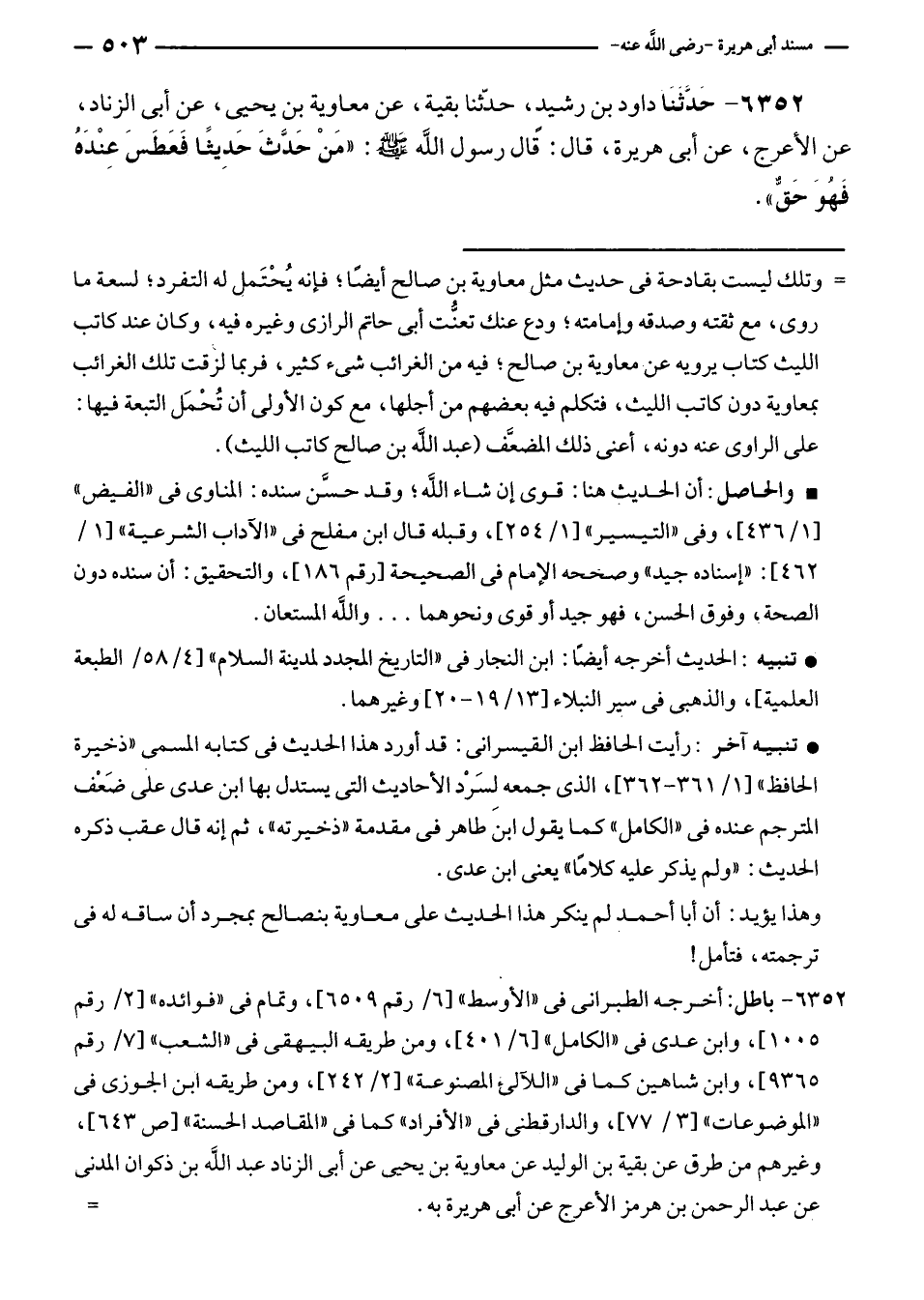 ٦٣٥٢ - حَدَّثَنَا داود بن رشيدٍ، حدّثنا بقية، عن معاوية بن يحيى، عن أبى الزناد، عن الأعرج، عن أبى هريرة، قال: قال رسول الله - صلى الله عليه وسلم -: "مَنْ حَدَّثَ حَدِيثًا فَعَطَسَ عِنْدَهُ فَهُوَ حَقٌّ".
